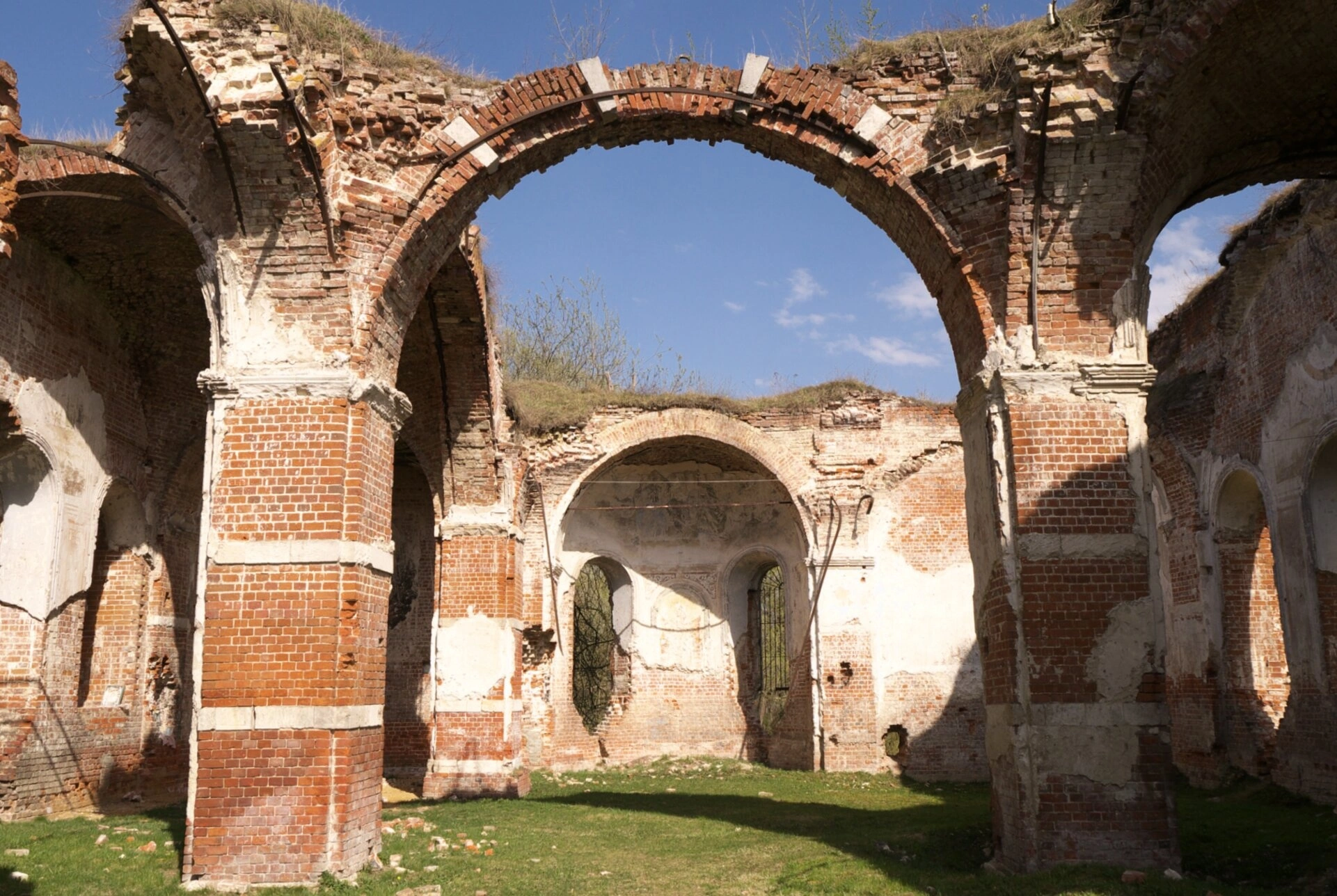 Внутреннее пространство храма, некогда освященное для молитвы, ныне поглощено луговой травой, а под сводами голубого неба лишь ветер напевает вечную память по утраченной святыне. Руины вызывают чувство благоговейной печали и напоминают о бренности земного, призывая к молитвенной памяти о утраченных духовных центрах России.