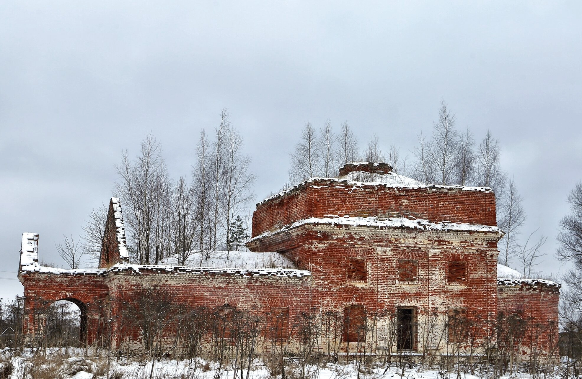 Стены обители несут на себе следы многолетнего воздействия непогоды: штукатурка осыпалась, кирпич выветрился и разрушается. В зимний период, когда был сделан снимок, верхние части стен и земля вокруг покрыты слоем снега, что усиливает ощущение скорби и утраты. Деревья на заднем плане стоят без листвы, а небо затянуто серыми облаками, создавая единую гармонию печали.