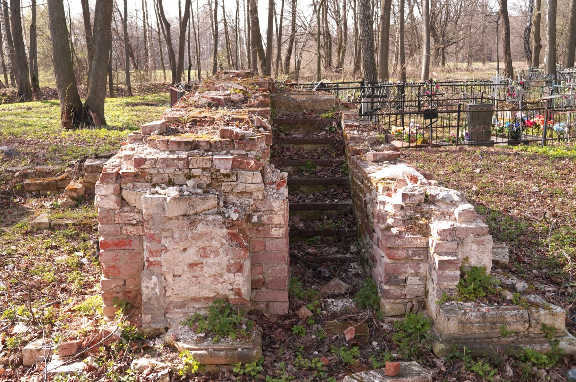 На снимке видны фрагментарно сохранившиеся стены из красного кирпича, которые даже в своем разрушенном состоянии позволяют discern очертания алтарной апсиды и частично — основного объёма здания. Вокруг поросшего травой основания храма просматриваются намогильные памятники, свидетельствующие о том, что территория вокруг церкви historically использовалась как погост — место упокоения православных христиан.