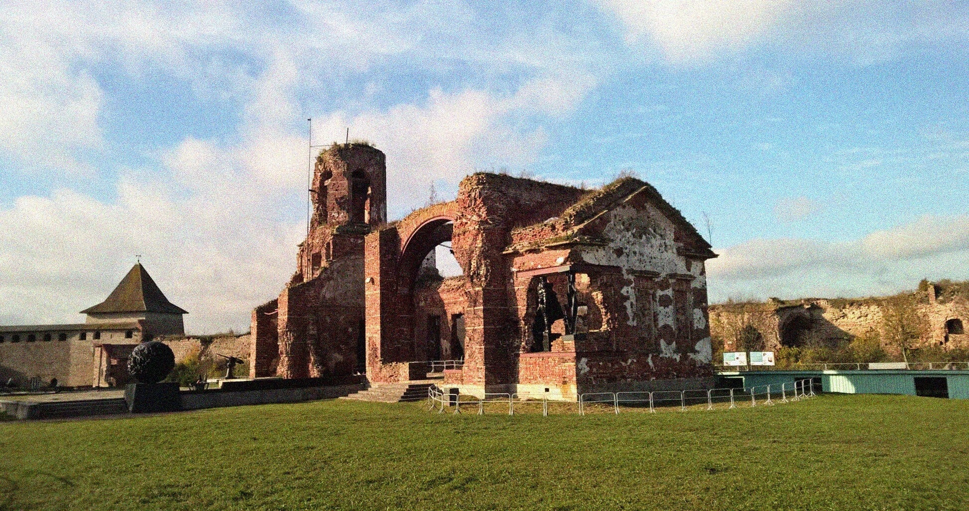 На представленной фотографии запечатлены величественные руины собора Рождества Святого Иоанна Предтечи, расположенного в историческом сердце крепости Орешек на Ореховом острове. Храм, возведённый из красного кирпича в первой половине XIX столетия, ныне предстаёт перед нами в состоянии благоговейного покоя: его некогда высокие стены частично разрушены, а могучие арки устремились в небо, напоминая о былом величии.