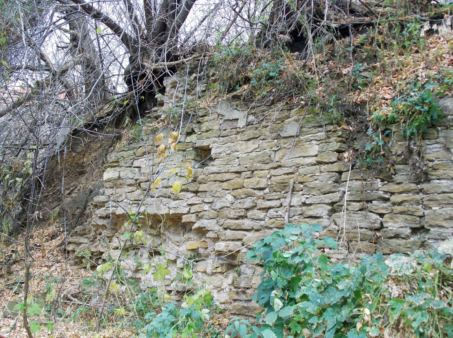 На фотографии видна подпорная стена или часть фундамента, находящаяся в полуразрушенном состоянии. Камни, скреплённые раствором, сильно выветрены, а между ними пробивается кустарник и деревья с голыми ветвями, что указывает на осенний сезон. Руины расположены на склоне холма или оврага, что характерно для многих старых церковных участков.