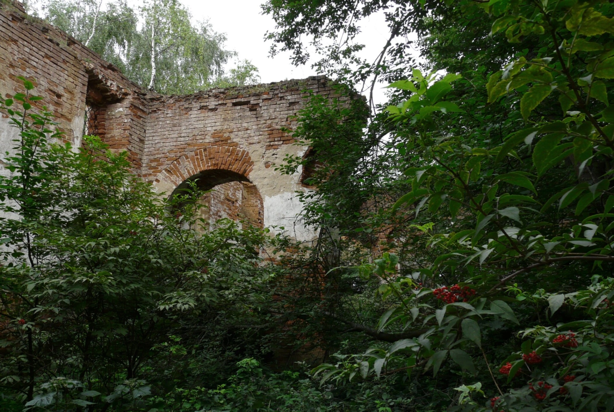 Частично сохранившиеся стены сложены из красного кирпича, демонстрируя характерную для своего времени кладку. Угадываются очертания арок, оконных проёмов и, возможно, алтарной части, что позволяет предположить церковное назначение постройки. Природа постепенно возвращает себе территорию: деревья и кустарники прорастают сквозь разрушенные своды, а у основания стен виднеются кусты с алыми ягодами, символизируя непрерывность жизни.