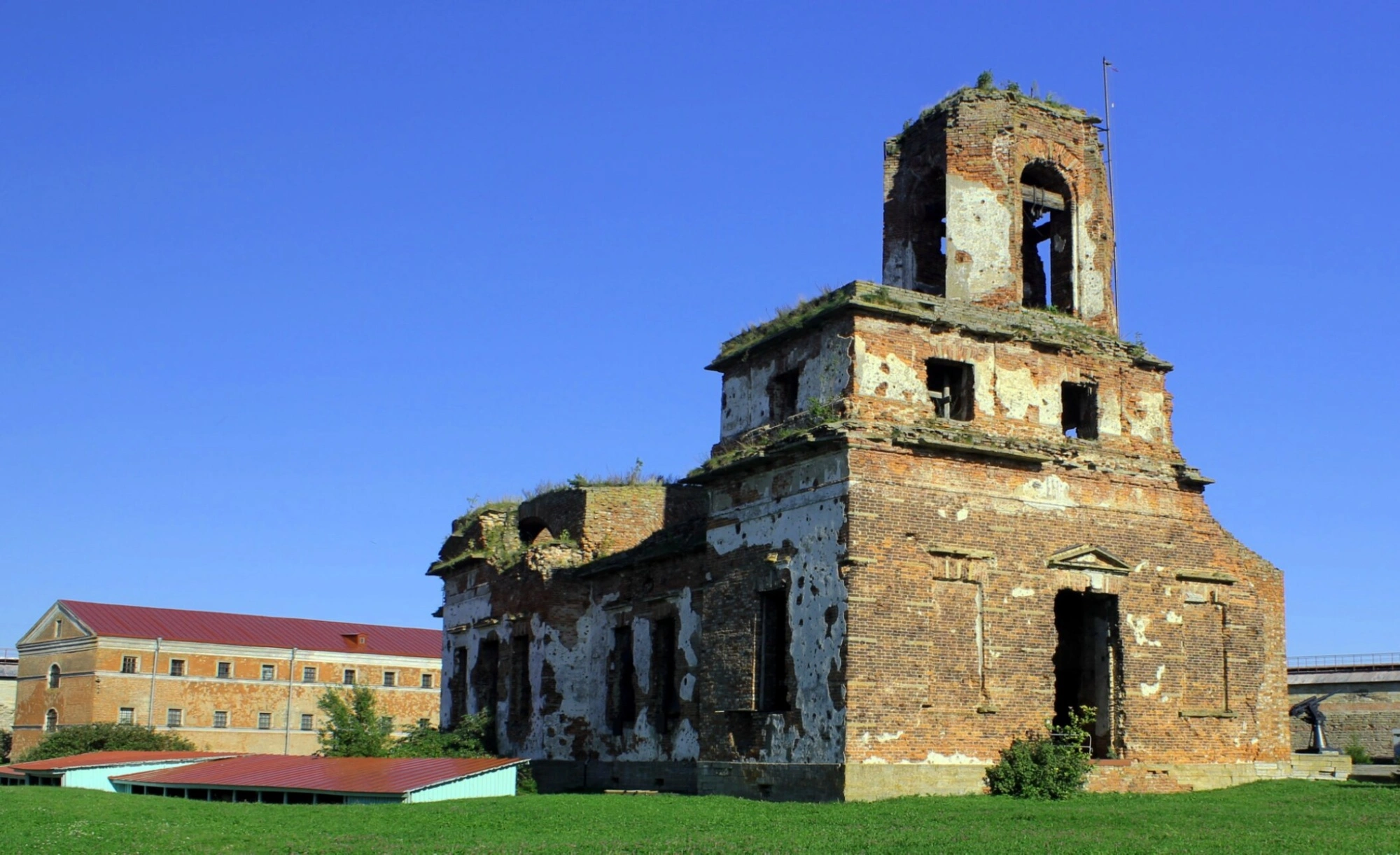 На представленной фотографии запечатлены скорбные, но величественные руины собора Рождества святого Иоанна Предтечи, находящегося на территории древней крепости Орешек. Каменные стены, израненные осколками и лишённые кровли, молчаливо свидетельствуют о трагических событиях прошлого, являясь одновременно памятником русской воинской славы и православной веры.