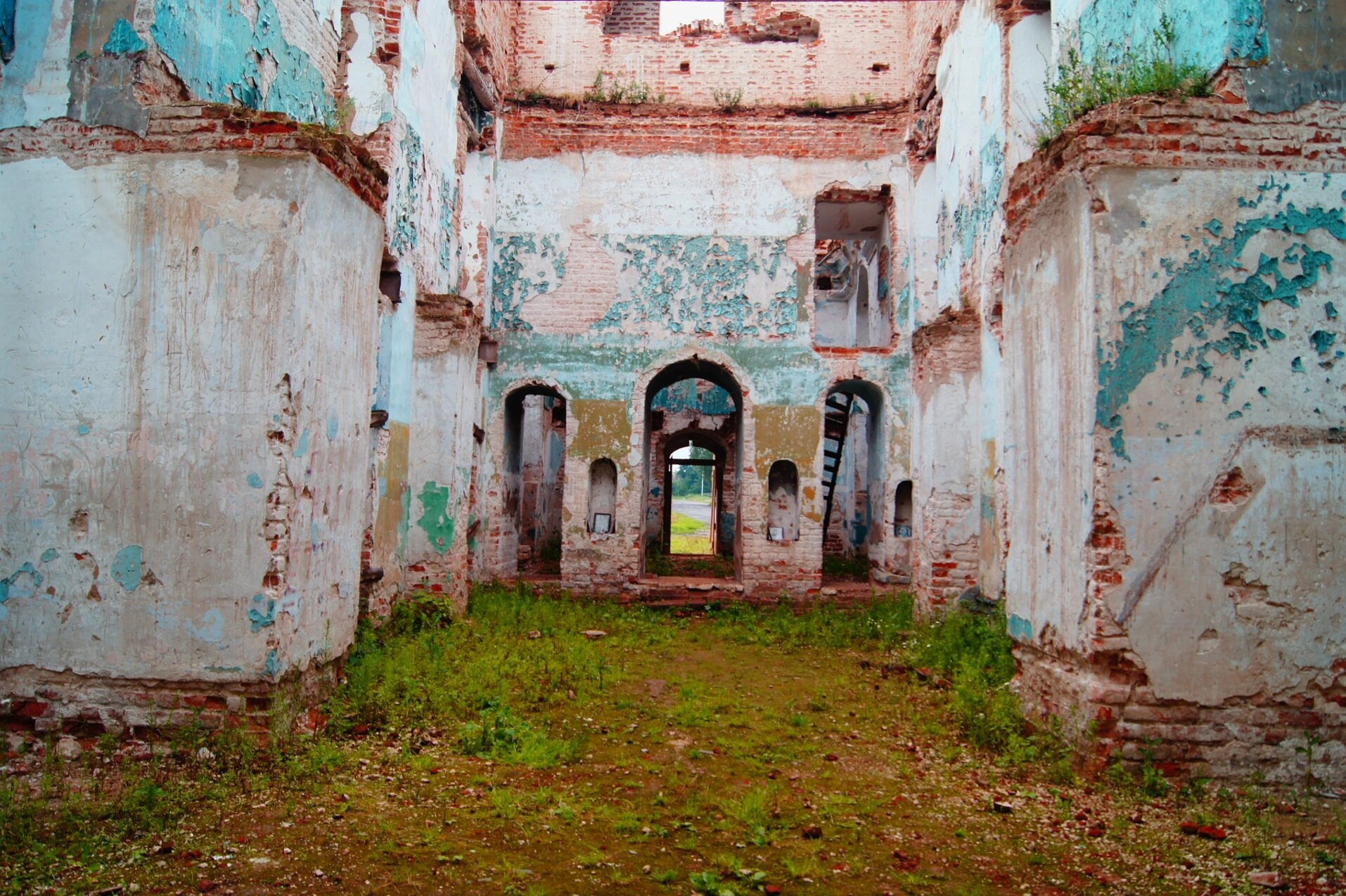На представленной фотографии запечатлены скорбные, но исполненные былого величия руины Спасо-Преображенского храма, расположенного в старинном селе Хотылёво Брянской области. Этот некогда величественный православный собор пребывает ныне в глубоко разрушенном состоянии: обрушены своды, частично утрачены стены, а от внутреннего убранства не осталось и следа.