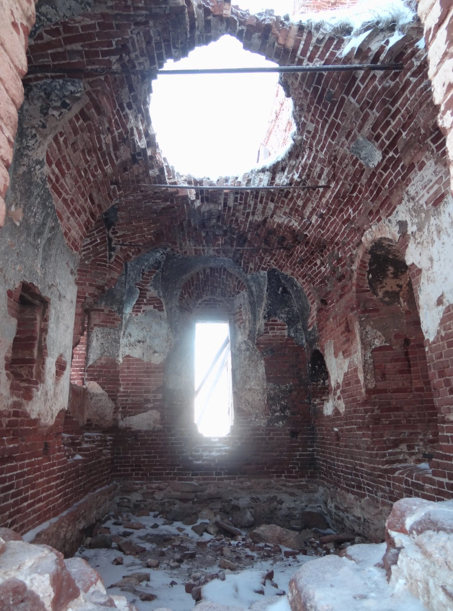Суровые уральские зимы довершают процесс разрушения: на плитах пола лежат плотные слои снега, а кирпичная кладка стен и арочных сводов, испещренная трещинами и осыпями, продолжает неуклонно разрушаться под воздействием времени и непогоды. Несмотря на плачевное состояние, в архитектурных деталях еще угадывается былой строгий и величественный облик церковного здания, возведенного из добротного красного кирпича.