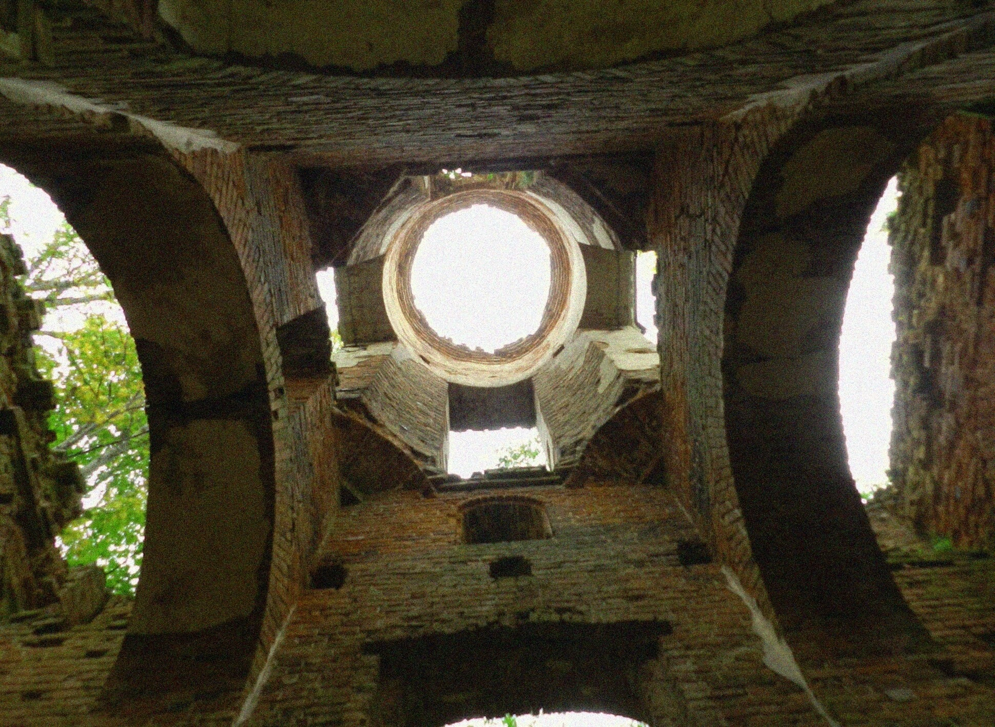 Святыня была воздвигнута во имя Успения Божией Матери – одного из двенадцати великих церковных праздников. Архитектура постройки относится к концу XVIII – началу XIX века и воплощает характерные для того периода стилистические черты. На снимке отчетливо просматривается мощная кирпичная кладка, образующая арочные проемы и своды, которые некогда поддерживали купольную часть храма. Круглый проем в своде, через который ныне виднеется небо, прежде, вероятно, служил основанием для светового барабана купола.