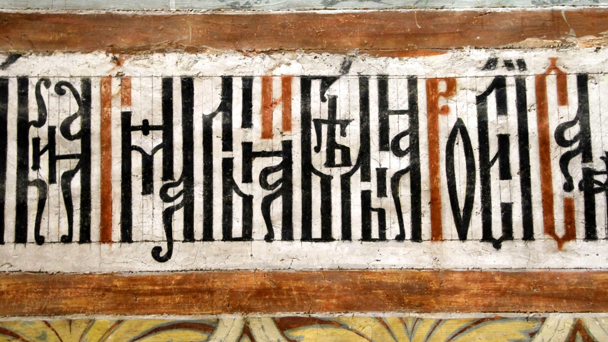 Вязью в древнерусской книжности и церковной живописи традиционно исполнялись сакральные тексты — богослужебные надписи, цитаты из Священного Писания и молитвенные обращения. Подобные эпиграфические фризы typically располагались в верхних регистрах храмовых росписей, обрамляя своды и барабаны куполов. В данном случае под красной полосой просматривается фрагмент растительного орнамента, характерного для костромской школы фресковой живописи XVII века.