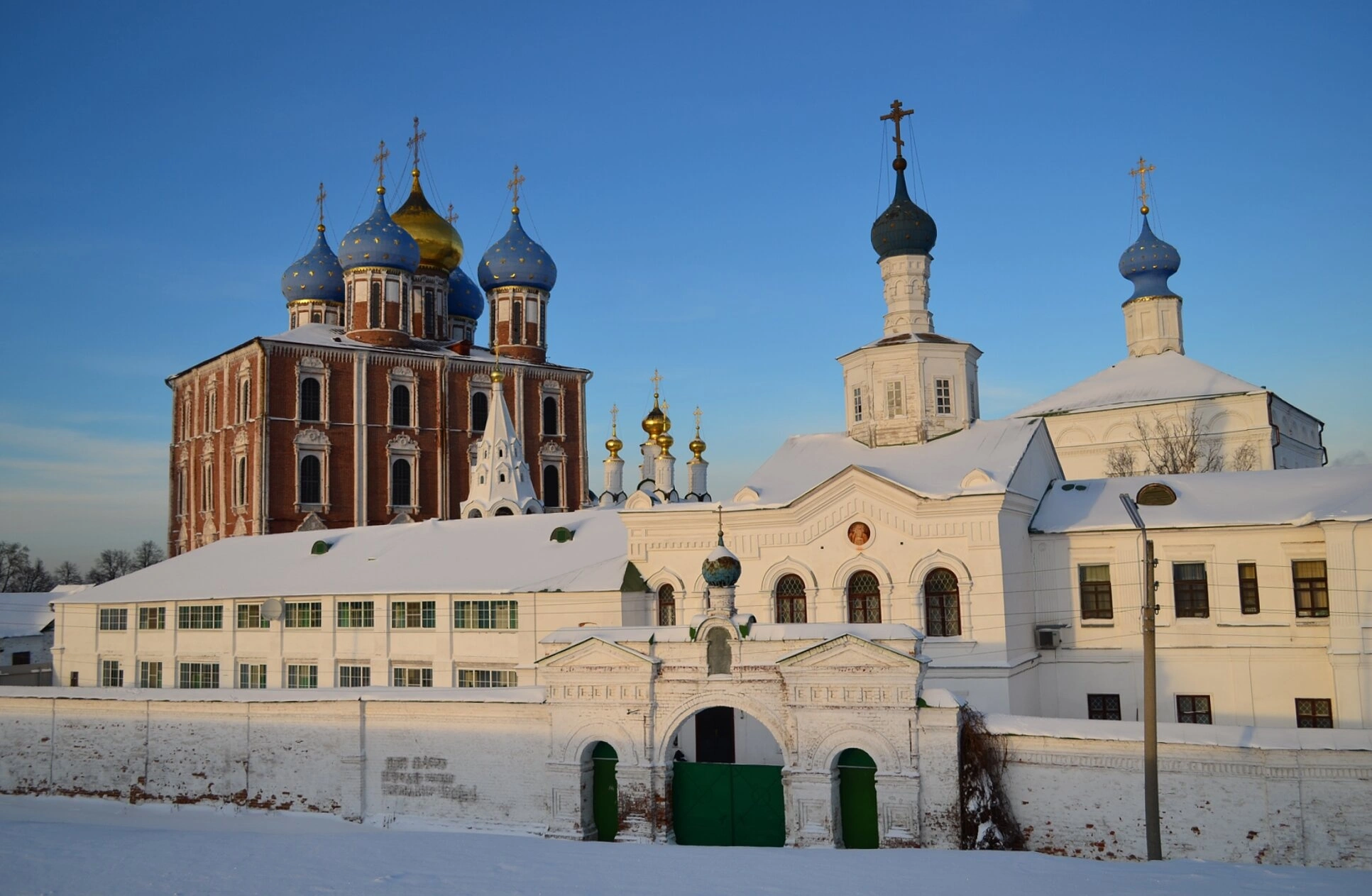 - Рязанский кремль в зимнем убранстве: архитектурный ансамбль Успенского собора и Спасского монастыря
