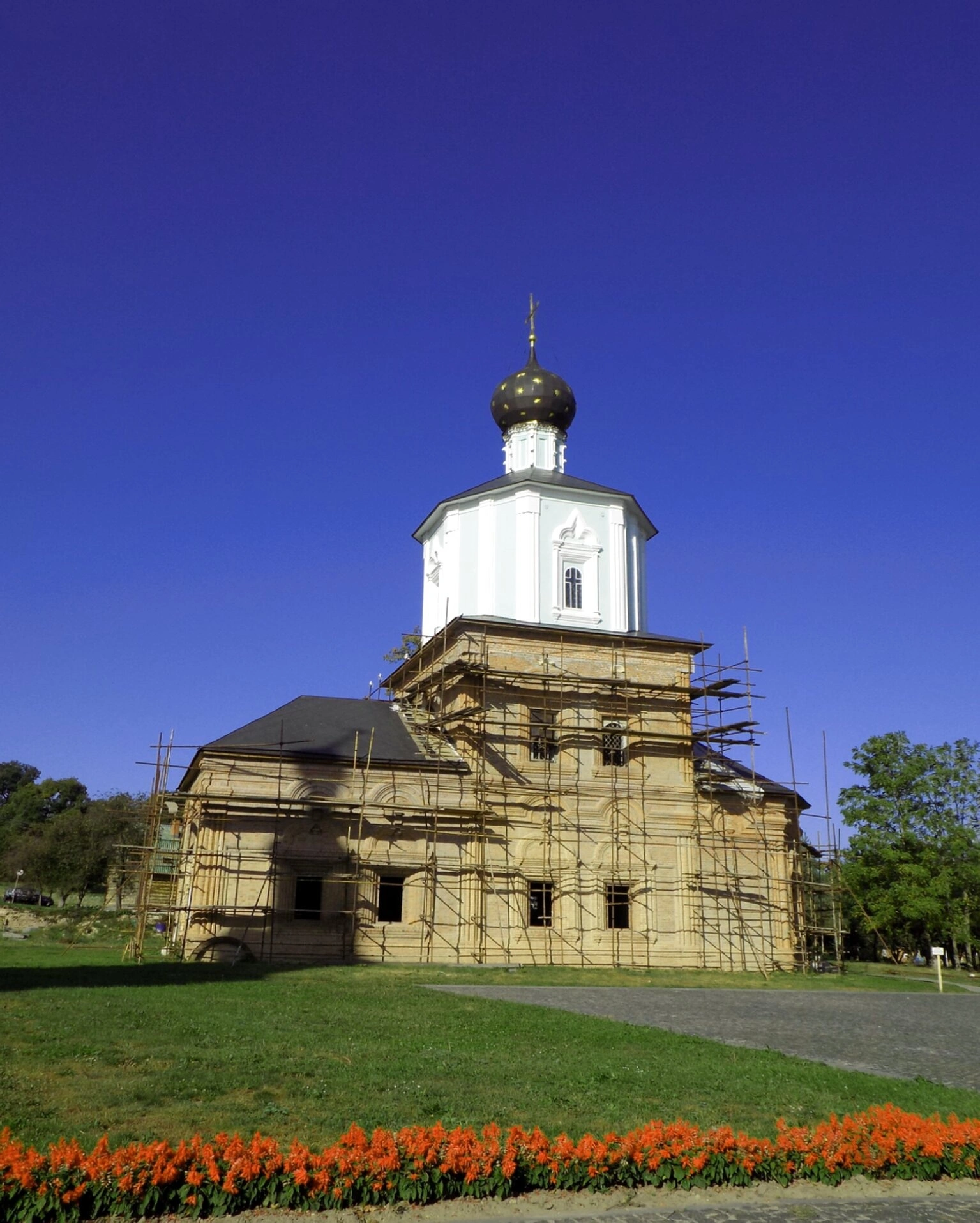 На представленной фотографии запечатлён Рыльский Свято-Николаевский мужской монастырь — одна из древнейших и наиболее почитаемых православных обителей Курской митрополии. Монастырь, частично укрытый строительными лесами, находится в процессе реставрации, что свидетельствует о непрестанных трудах по сохранению нашего национального духовного наследия.