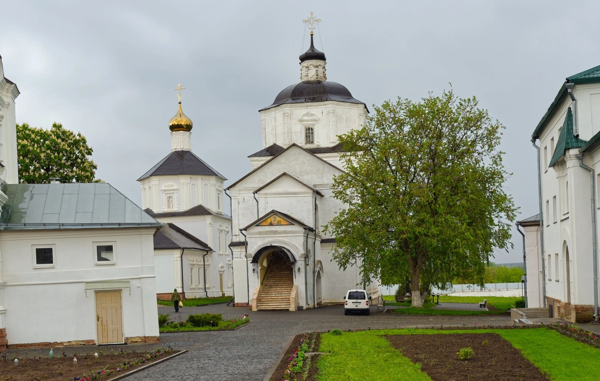 Особую ценность представляет главный собор монастыря — Никольский храм, который является сердцем этой духовной твердыни. Монастырь, переживший годы запустения в безбожную эпоху, был возрождён к жизни в конце XX века и ныне является действующим, привлекая паломников со всей России. С его территории открывается прекрасный вид на пойму реки, что добавляет пейзажу особого величия и спокойствия. Данная фотография не только передаёт архитектурную красоту святого места, но и позволяет ощутить его глубокую молитвенную атмосферу.