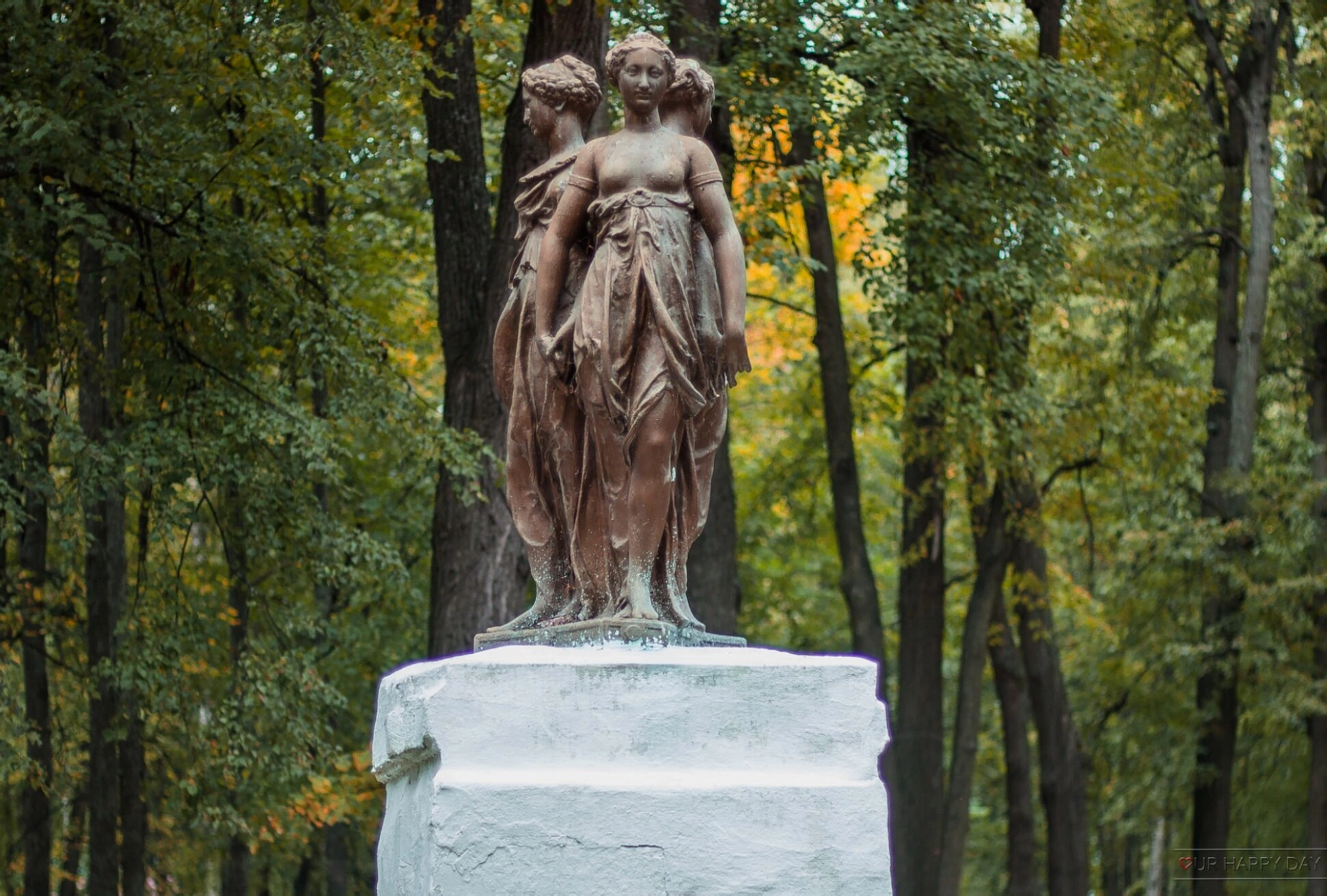 На представленной фотографии запечатлена бронзовая скульптурная композиция «Три грации», установленная в городской среде Шуи. Данное произведение парковой пластики представляет собой три женские фигуры, расположенные спиной друг к другу и образующие гармоничную круговую композицию.