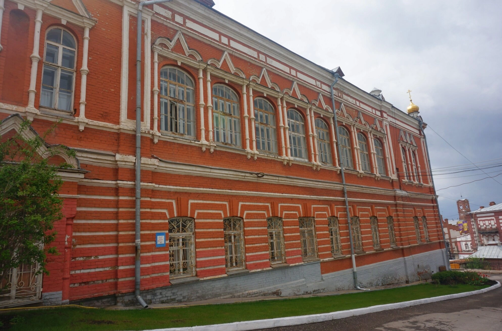 На представленной фотографии запечатлено одно из зданий Самарского Иверского женского монастыря, являющегося одной из главных православных святынь города. Здание, выстроенное из красного кирпича с изящными белоснежными декоративными элементами, представляет собой прекрасный образец церковной архитектуры конца XIX — начала XX века. Его фасад украшен изразцовыми орнаментами и горизонтальными поясами, что придаёт облику строения торжественность и благолепие.