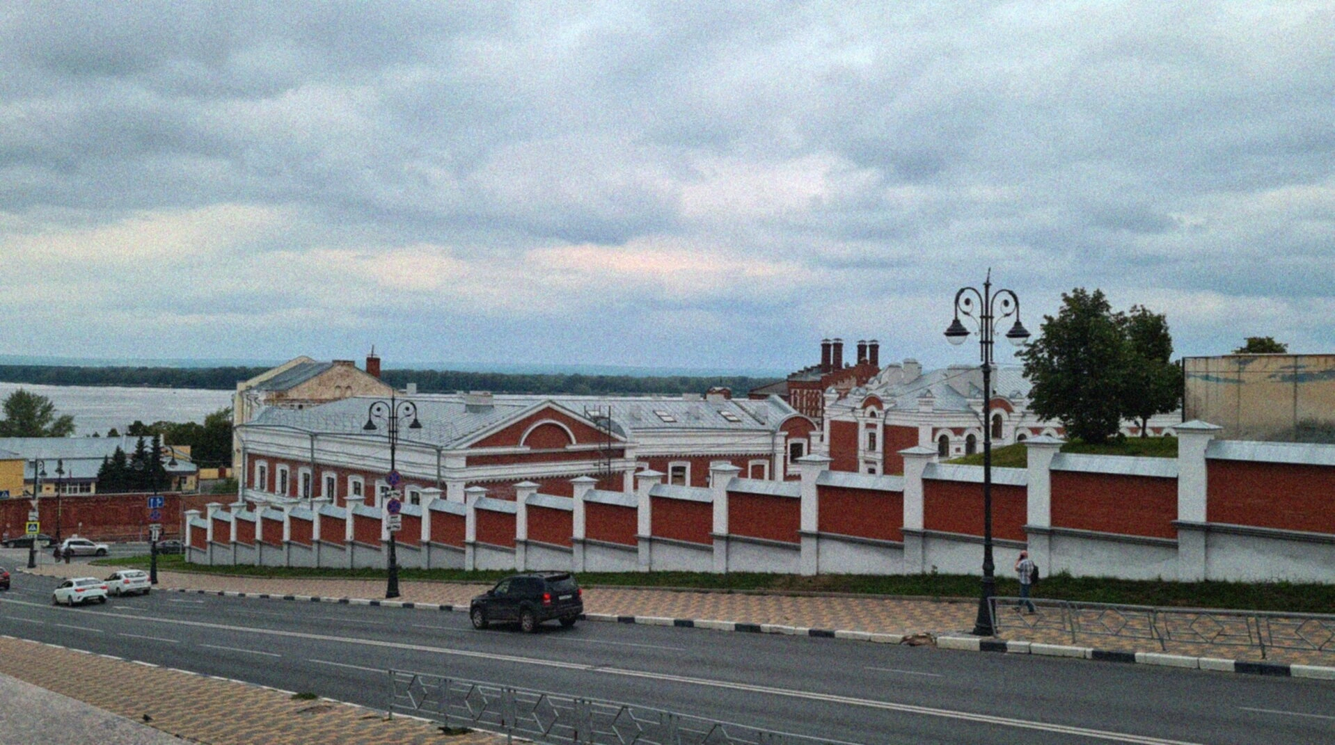 На заднем плане открывается вид на водную гладь, предположительно реки Волги, что добавляет пейзажу особую духовную символику и спокойствие. Пасмурное, облачное небо создаёт особое настроение, напоминая о вечном и непреходящем.