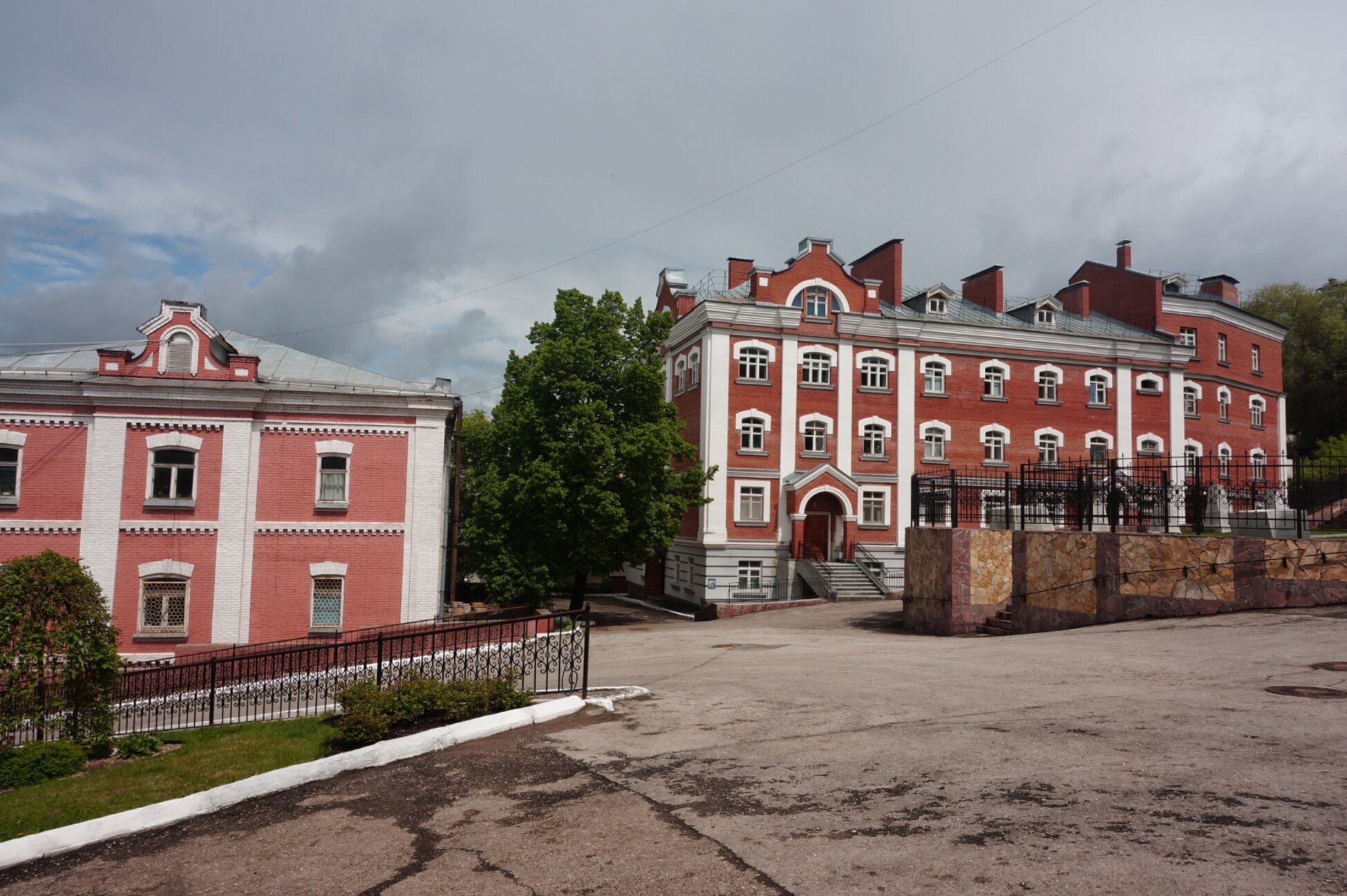 На снимке видны несколько монастырских зданий разной этажности, соединённых между собой дорожками и ограждениями. Зелёные насаждения и элементы благоустройства придают территории ухоженный и мирный вид. Монастырь был основан в середине XIX века и за свою историю пережил периоды расцвета, закрытия в годы гонений на Церковь и возрождения в конце XX столетия.