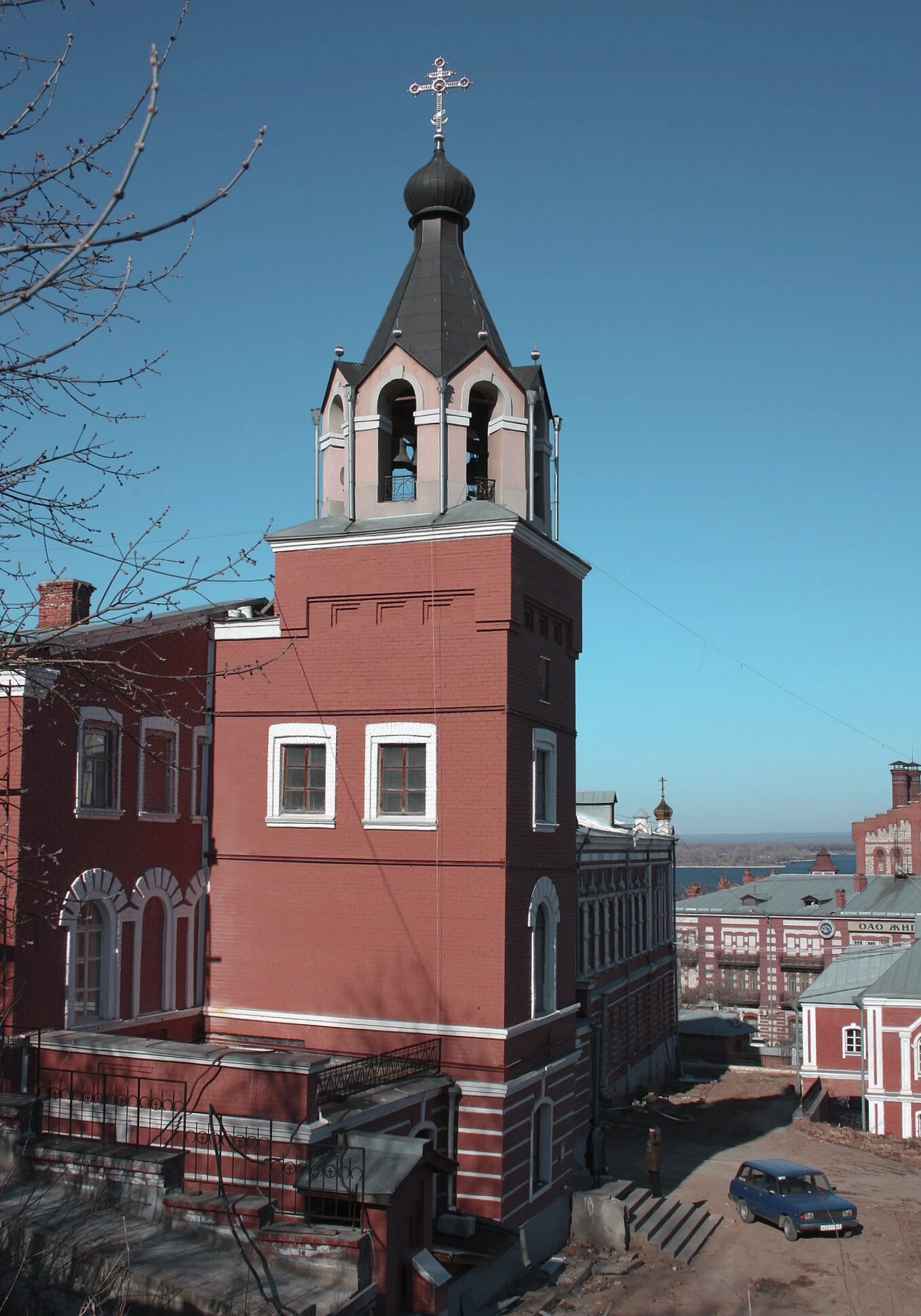 За колокольней видны корпуса монастырских построек, выполненные из красного кирпича в традициях русского церковного зодчества второй половины XIX века. За монастырской оградой открывается вид на великую русскую реку Волгу и городской пейзаж на противоположном берегу.