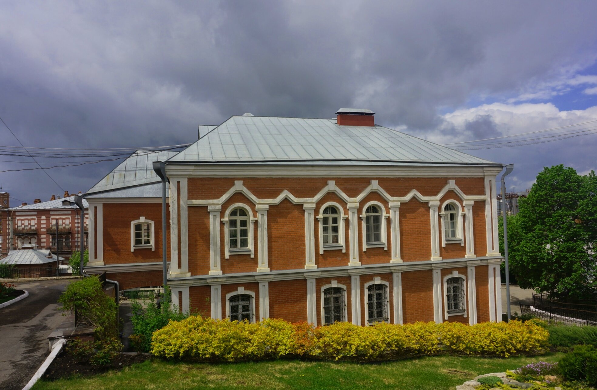 На представленной фотографии запечатлено одно из зданий Самарского Иверского женского монастыря, исторической православной обители, расположенной на Волжском проспекте. Двухэтажное кирпичное здание, выкрашенное в благолепный красный цвет и украшенное белоснежным декоративным убранством, является образцом церковной архитектуры своего времени. Белые элементы обрамляют оконные проёмы и углы здания, подчёркивая его строгие и гармоничные формы, а венчает строение скромная серая металлическая кровля.