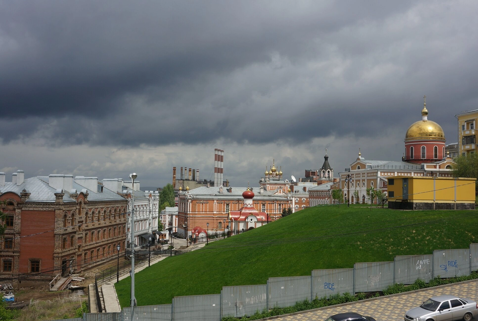 На переднем плане снимка виден ухоженный зелёный склон, который спускается к дороге, отделяющей монастырские владения от городской застройки. Справа от холма выделяется яркое жёлтое здание, возможно, один из жилых или административных домов Самары. Центром композиции и главным объектом фотографии выступает сам монастырский ансамбль. Его мощные стены красного кирпича, увенчанные сияющими на солнце золотыми куполами храмов, создают впечатление неземной красоты и духовной твердыни.