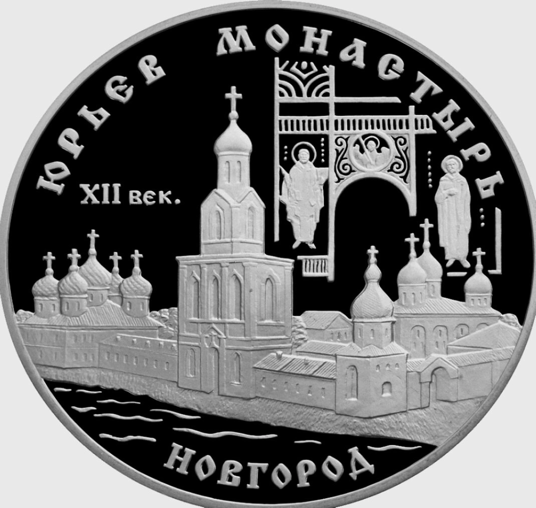 - Серебряная монета с видом Свято-Юрьева мужского монастыря в Великом Новгороде