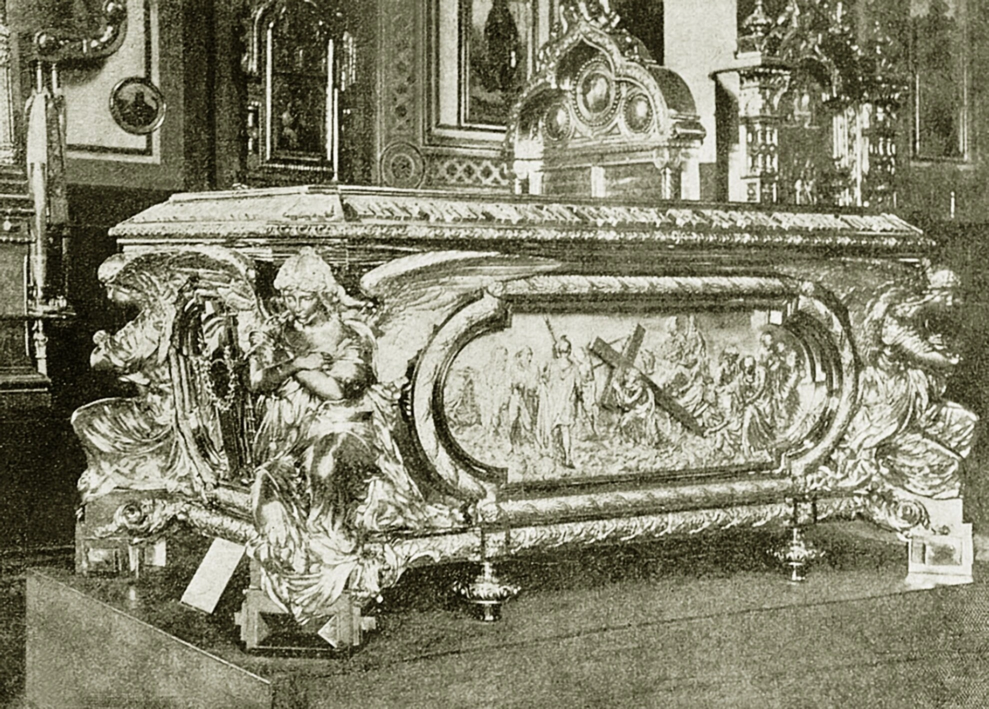 Церковь Священномученика Мирония, в стенах которой находилась эта рака, была построена в 1849–1855 годах по проекту архитектора Константина Тона и освящена в честь небесного покровителя полка. Храм, служивший духовным центром для воинов-егерей, был варварски уничтожен в 1934 году в период богоборческих гонений. Фотография является бесценным свидетельством утраченного духовного и культурного наследия Российской Империи, сохраняя для потомков память о красоте и благолепии внутреннего убранства одной из столичных святынь.