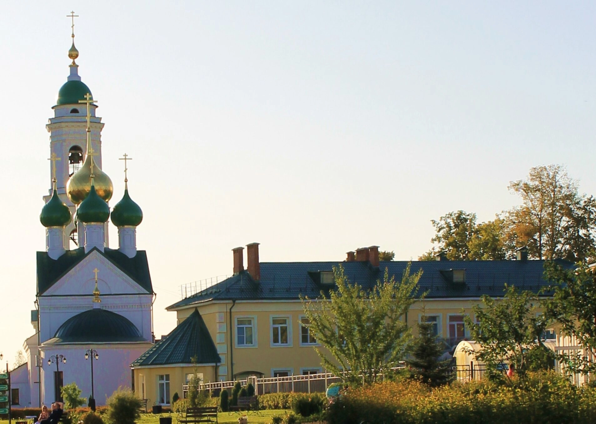Передний план фотографии занимает благоустроенная территория сквера с аккуратными зелёными насаждениями и скамейками для отдыха, что создаёт атмосферу умиротворения и способствует благому настрою паломников и прихожан. Основанная как подворье Серафимо-Дивеевского монастыря, Сергиевская слобода является значимым духовным центром, привлекающим верующих со всей России. Этот уголок земли, освящённый молитвами, продолжает нести свою высокую миссию, храня традиции православной веры и являя собой образец благолепия и благочестия.