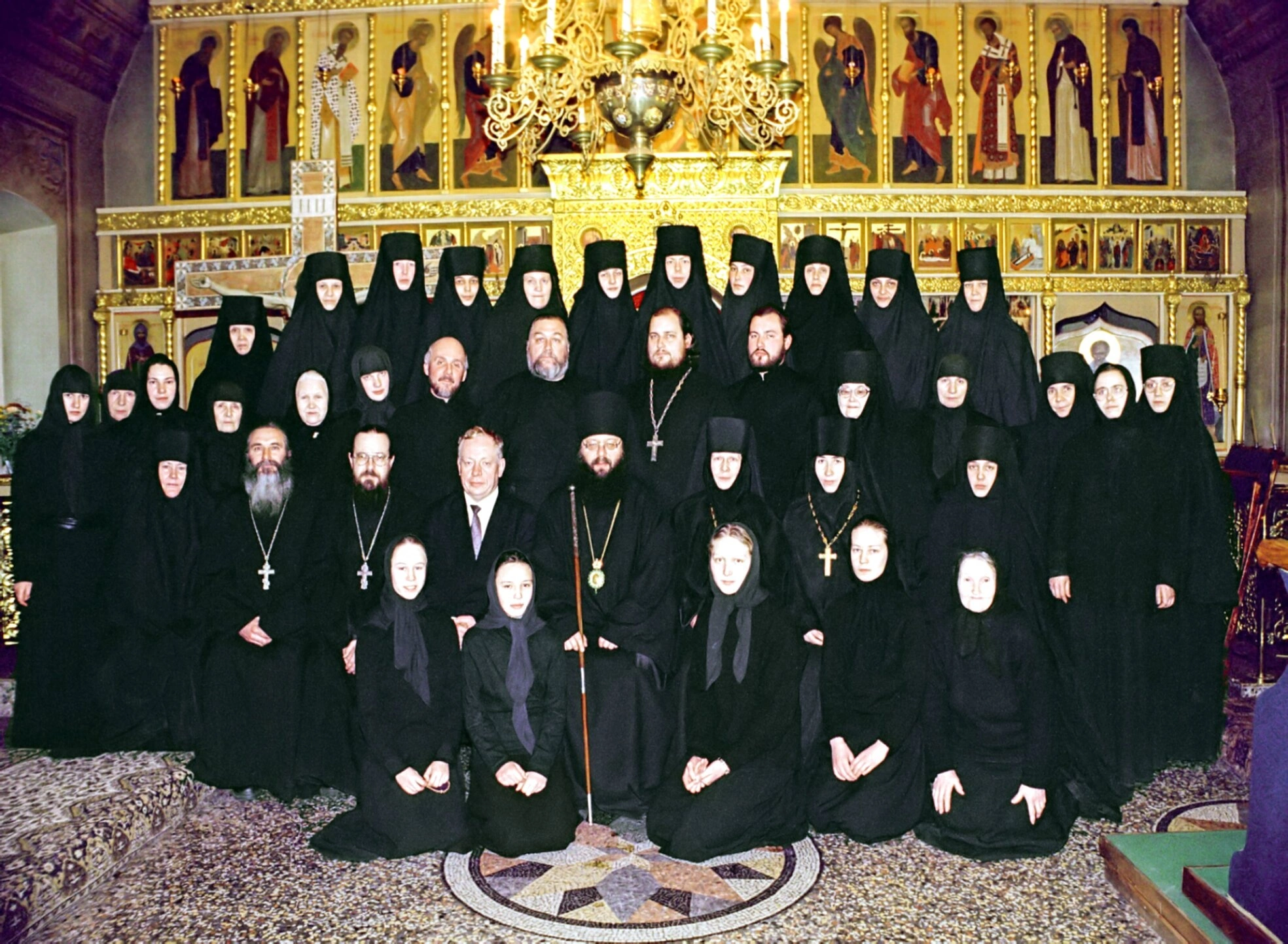 На архивной фотографии 2003 года запечатлена группа насельниц Свято-Николо-Сольбинского женского монастыря, расположенного в Ярославской области. Снимок сделан в священном пространстве одного из храмов обители, о чём свидетельствует видимый на заднем плане резной золочёный иконостас с рядами святых образов.