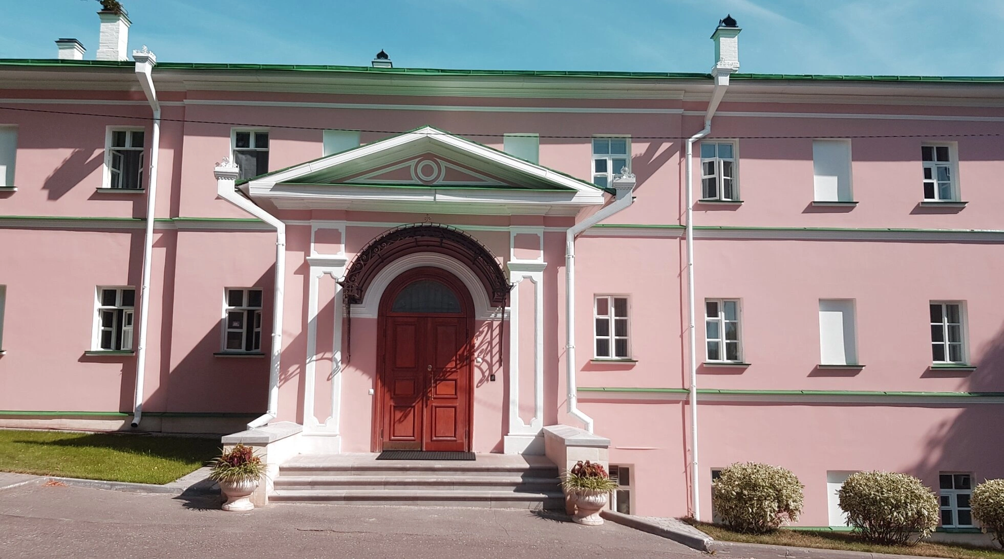 Фасад корпуса выкрашен в благостный нежно-розовый цвет, что создаёт ощущение умиротворения и духовной радости. Центральным элементом композиции является входная группа, оформленная с подобающим величием: массивная деревянная дверь, полукруглый козырьок и белоснежные колонны, которые поддерживают фронтон. По бокам симметрично расположены прямоугольные окна с белыми рамами, через которые в келии и служебные помещения проникает божественный свет.