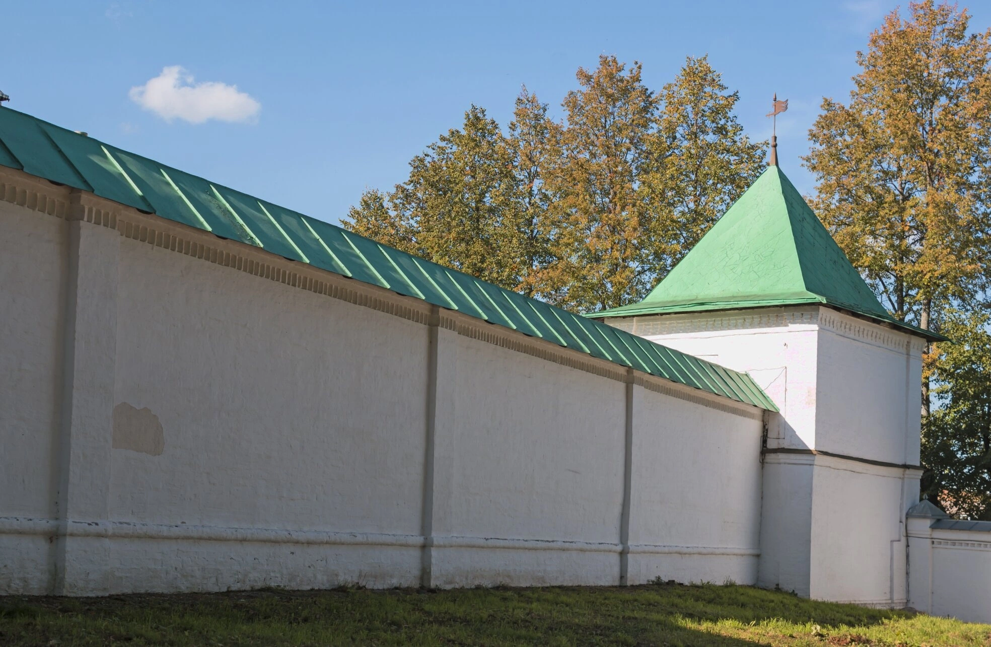 На представленной фотографии запечатлён фрагмент северо-западной части ограды Свято-Феодоровского женского монастыря, одной из древнейших православных обителей города Переславля-Залесского. Белокаменная крепостная стена и стройная башня, увенчанная остроконечным шатром зелёного цвета, являются характерными образцами русского монастырского зодчества, предназначенного не только для защиты, но и для молитвенного уединения.