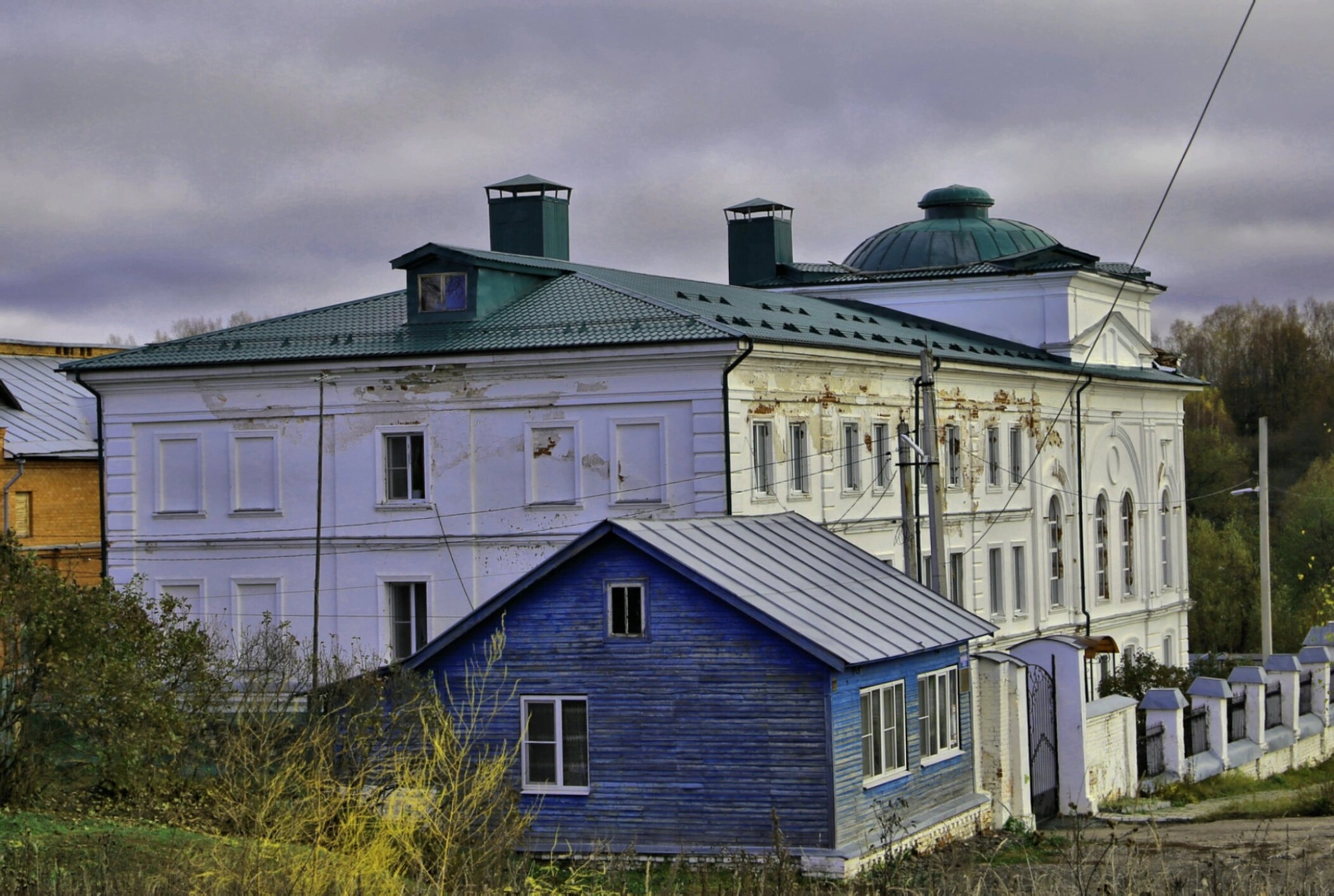 Слева от основного здания располагается небольшой деревянный дом, вероятно, служивший жильём для служителей или хозяйственным помещением. Осенняя растительность, окружающая строения, добавляет кадру особое настроение умиротворения и светлой печали, характерное для русской природы в межсезонье.