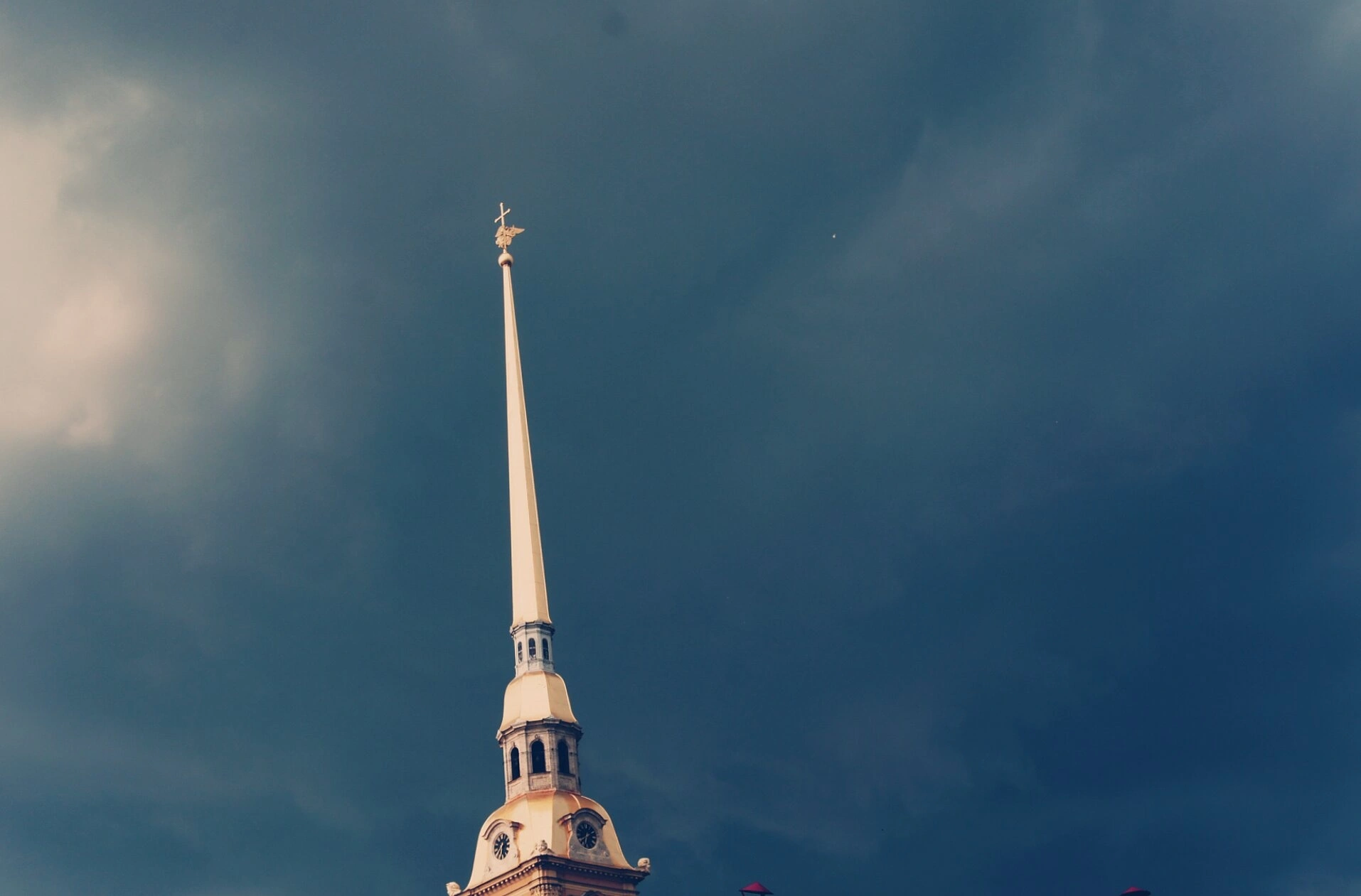На представленной фотографии запечатлён величественный шпиль собора во имя первоверховных апостолов Петра и Павла, являющегося архитектурной доминантой и символом Санкт-Петербурга. Высота колокольни, увенчанной золочёным шпилем, достигает 122,5 метра, что делает её одним из самых высоких православных сооружений в мире.