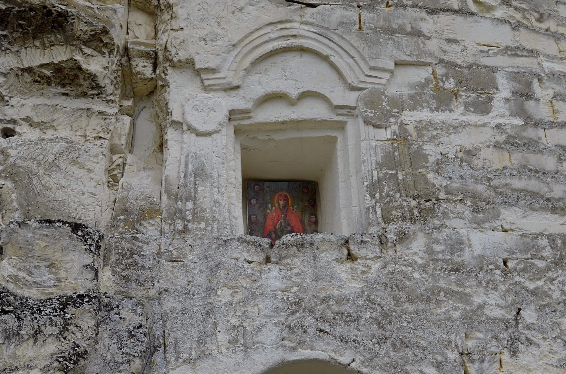На фотографии запечатлена уникальная православная святыня — чудотворная Сицилийская икона Божией Матери, пребывающая в естественной нише мелового массива у входа в пещерный храм, освящённый в Её честь. Этот уникальный храм является частью Успенского Дивногорского монастыря, расположенного на территории музея-заповедника «Дивногорье» в Воронежской области.