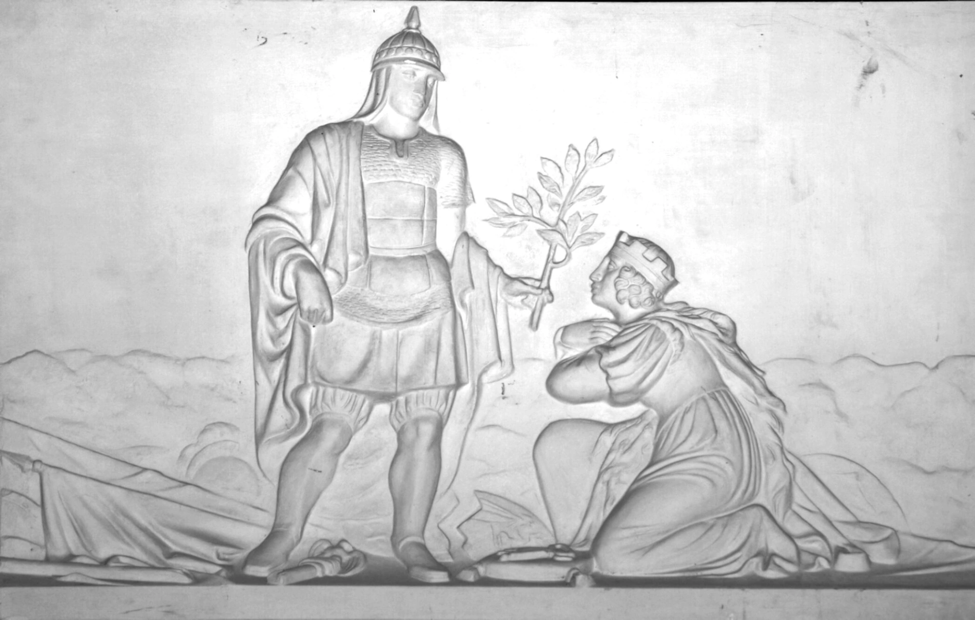 На представленной фотографии запечатлён художественный барельеф, расположенный в усадьбе Остафьево, которая исторически связана с храмом Троицы Живоначальной. Композиция изображает две символические фигуры в классическом стиле. Слева представлен воин в античных доспехах и шлеме, держащий в руке оливковую ветвь — традиционный символ примирения и божественного мира. Справа изображён коленопреклонённый правитель в мантии и короне, который протягивает воину книгу как знак мудрости и просвещения.