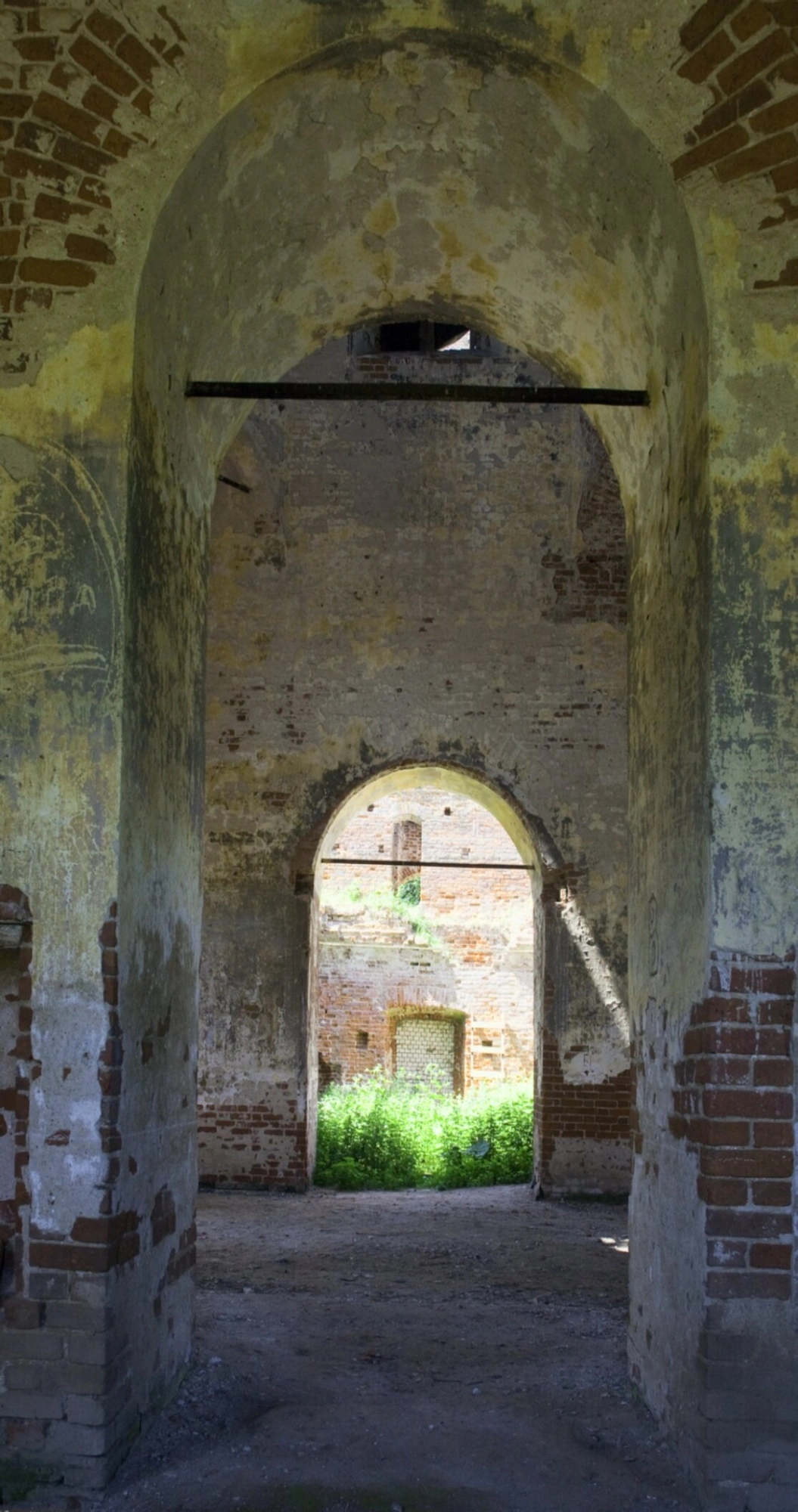 На фотографии запечатлен интерьер Скорбященского храма в селе Ассаурово, пребывавший в состоянии запустения после десятилетий поругания. Сводчатый арочный проход, сложенный из кирпича, демонстрирует следы утрат: облупившаяся штукатурка обнажает кладку, а на стенах угадываются фрагменты некогда прекрасной настенной росписи. Сквозь следующий арочный проем в глубине композиции видна заросшая территория, что символизирует долгие годы забвения, когда богослужебная жизнь в стенах церкви прервалась.