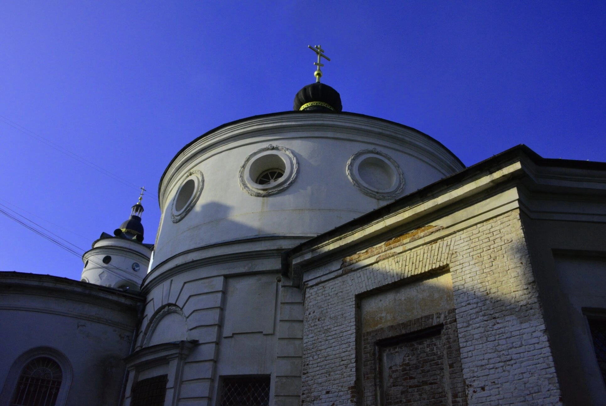 На фотографии запечатлена Скорбященская церковь в Твери — православный храм в честь чудотворной иконы Божией Матери «Всех скорбящих Радость». Каменный храм был возведён в период с 1780 по 1792 год на месте ранее существовавшей деревянной церкви, уничтоженной масштабным городским пожаром 1763 года. Архитектурный облик этого святого места уникален для тверского зодчества: он представляет собой редкую для города ротонду, выполненную в стиле классицизма, с объёмным семигранным алтарём, украшенным элементами барокко.
