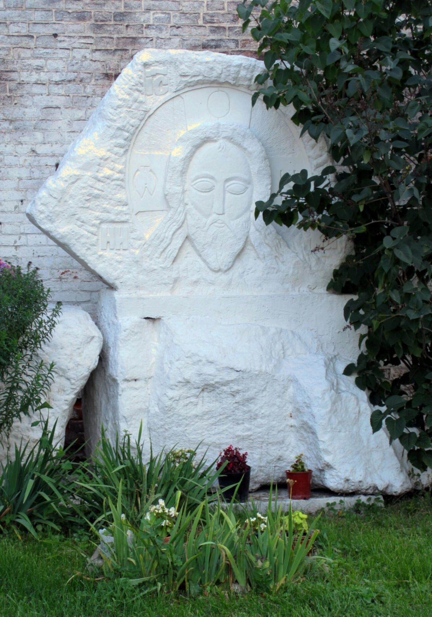 На представленной фотографии запечатлена уникальная белокаменная скульптура, расположенная в ограде храма во имя преподобного Симеона Столпника за Яузой. Скульптурный образ, выполненный из светлого камня, представляет собой рельефное изображение лика Спасителя нашего Иисуса Христа. Иконография образа отражает традиционные каноны православной иконописи, передавая одновременно строгость и милосердие.
