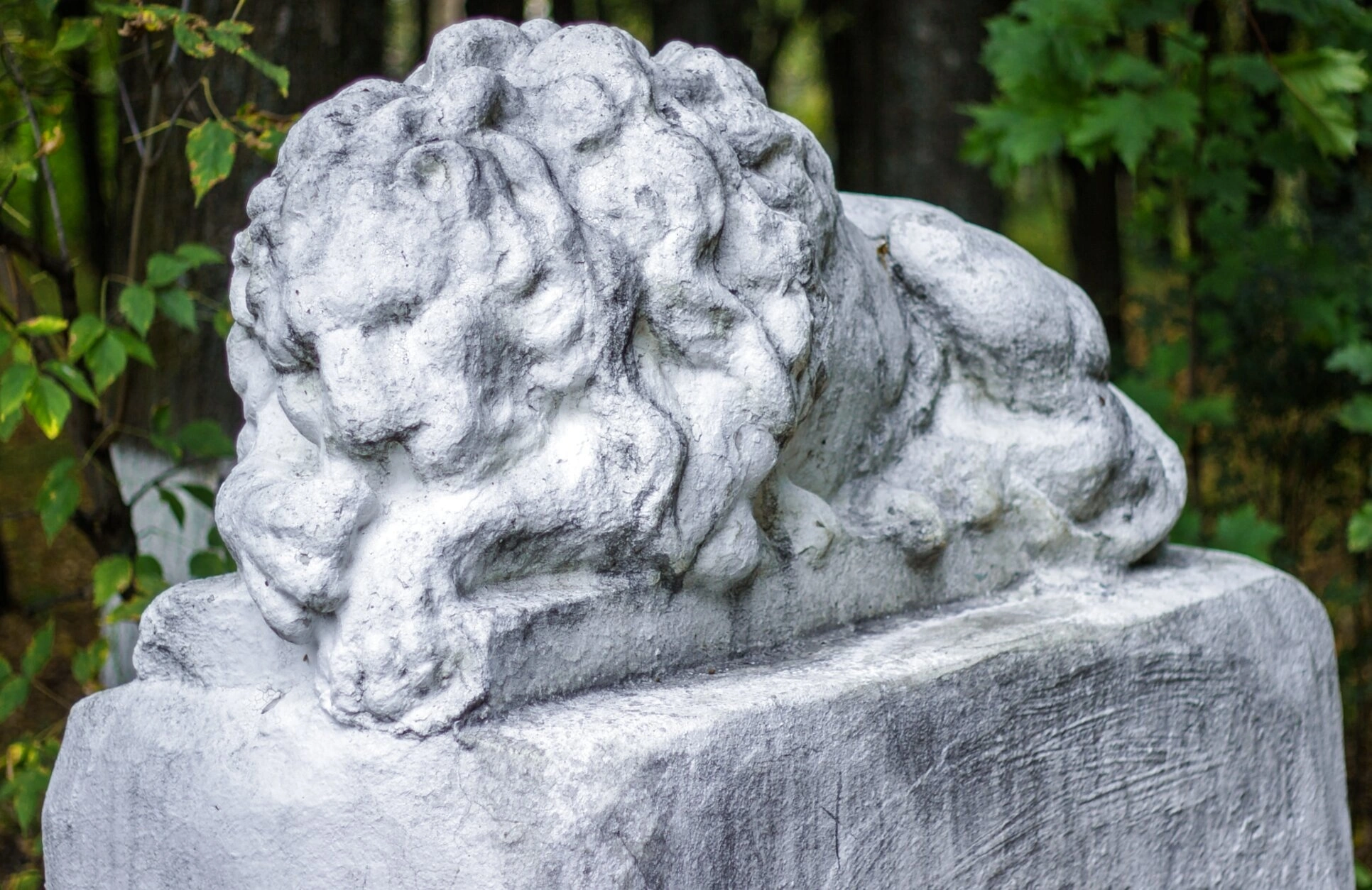 На представленной фотографии запечатлена монументальная каменная скульптура льва, возлежащего на массивном постаменте. Изваяние выполнено из серого камня и демонстрирует характерные следы естественного выветривания, что свидетельствует о его почтенном возрасте. Художественная проработка деталей позволяет различить мощную гриву и выразительные черты морды царственного животного, пребывающего в состоянии покоя.