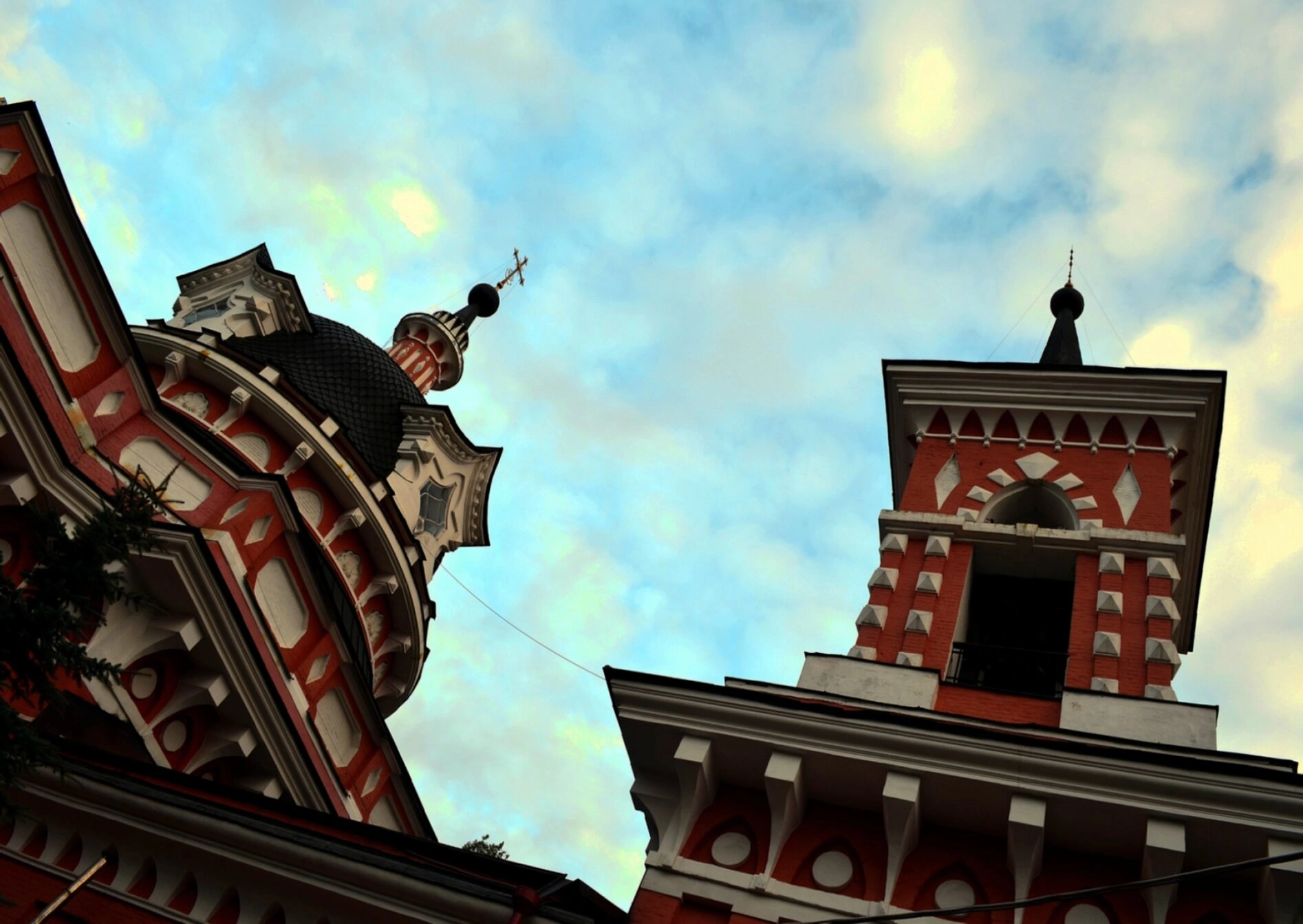 Слева виден главный купол храма, увенчаный православным крестом. Барабан купола и детали декора выполнены в сочетании красного кирпича и белых элементов, что создаёт характерный для русского церковного зодчества колорит. Тёмная кровля купола добавляет композиции solemnности и завершённости.
