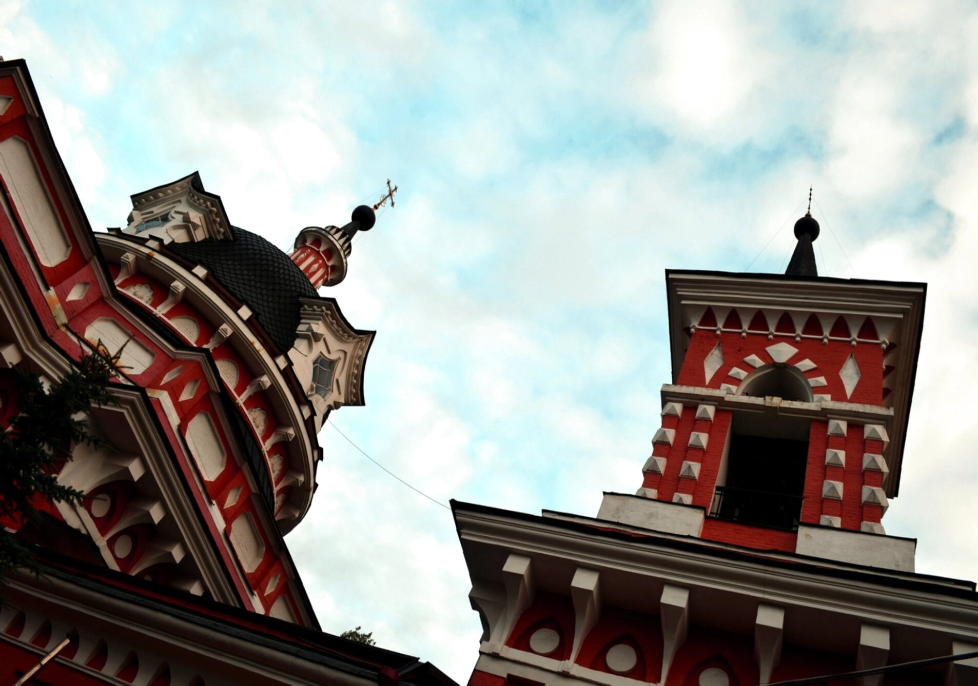 На снимке хорошо видны основные архитектурные элементы храма: величественная колокольня и устремлённые в небо золочёные купола, увенчанные православными крестами. Колокольня, выполненная в традициях русского церковного зодчества, имеет несколько ярусов, что характерно для храмовых построек XVIII-XIX веков. Купола, сияющие на солнце, символизируют небесную славу и горний мир, призывая верующих к молитве и богомыслию.