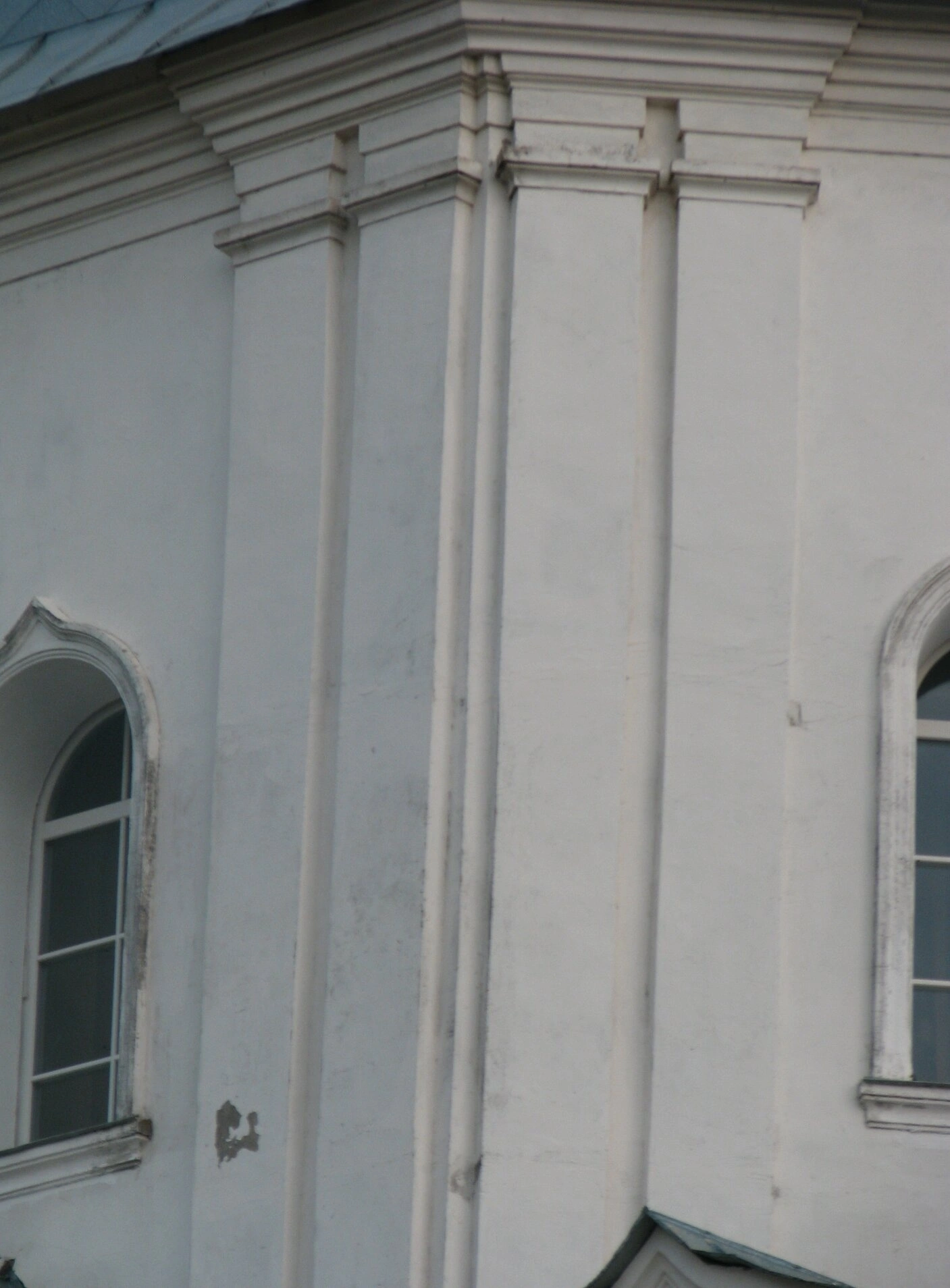 Здание является образцом русской храмовой архитектуры. На снимке хорошо читается угловая часть сооружения, где видны мощные пилястры, выполняющие роль декоративного и конструктивного элемента. Стены здания побелены, что характерно для многих православных церквей, создавая ощущение чистоты и величия. Важным архитектурным элементом, представленным на изображении, является арочный оконный проём, остеклённый для обеспечения естественного освещения внутреннего пространства храма. Завершает композицию венчающий карниз.