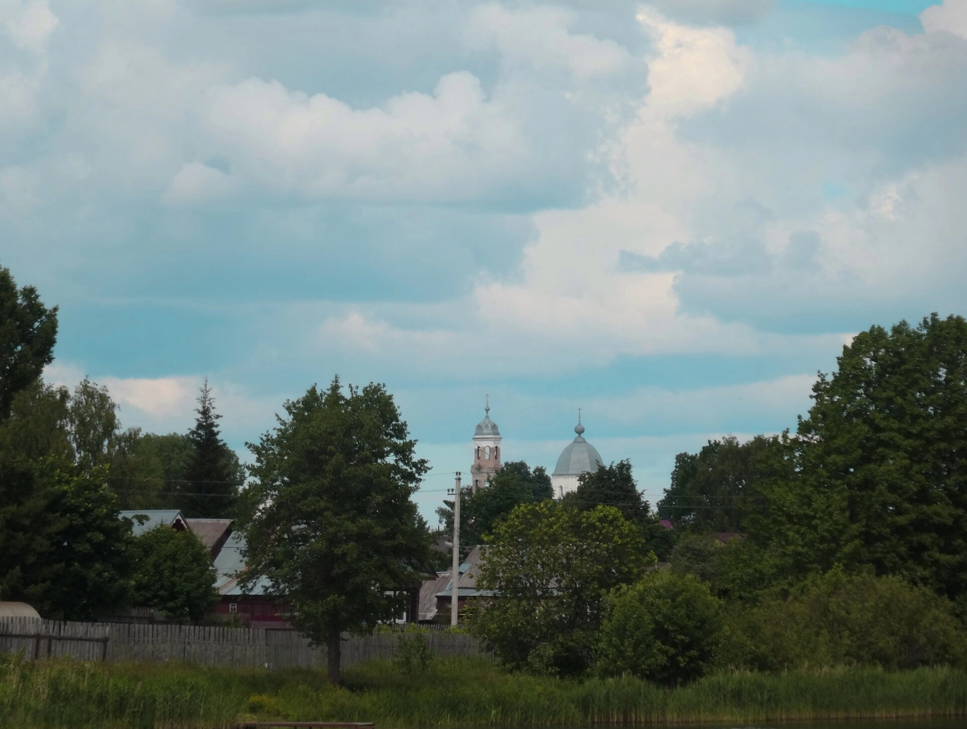Среди зелени возвышается величественный православный храм — Церковь иконы Божией Матери «Одигитрия» Смоленская. Чётко видны её центральный купол, колокольня и крыши строений, образующие единый гармоничный образ русского церковного зодчества. Храм является духовным центром и архитектурной доминантой данной местности.