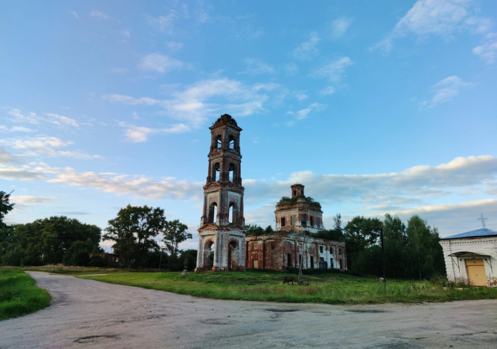 На представленной фотографии запечатлены скорбные, но величественные руины Смоленской церкви, некогда возвышавшейся в селе Арменки Нерехтского района Ярославской области. Храм, освящённый в честь Смоленской иконы Божией Матери, ныне пребывает в запустении, являясь безмолвным свидетелем былой духовной жизни этих мест.