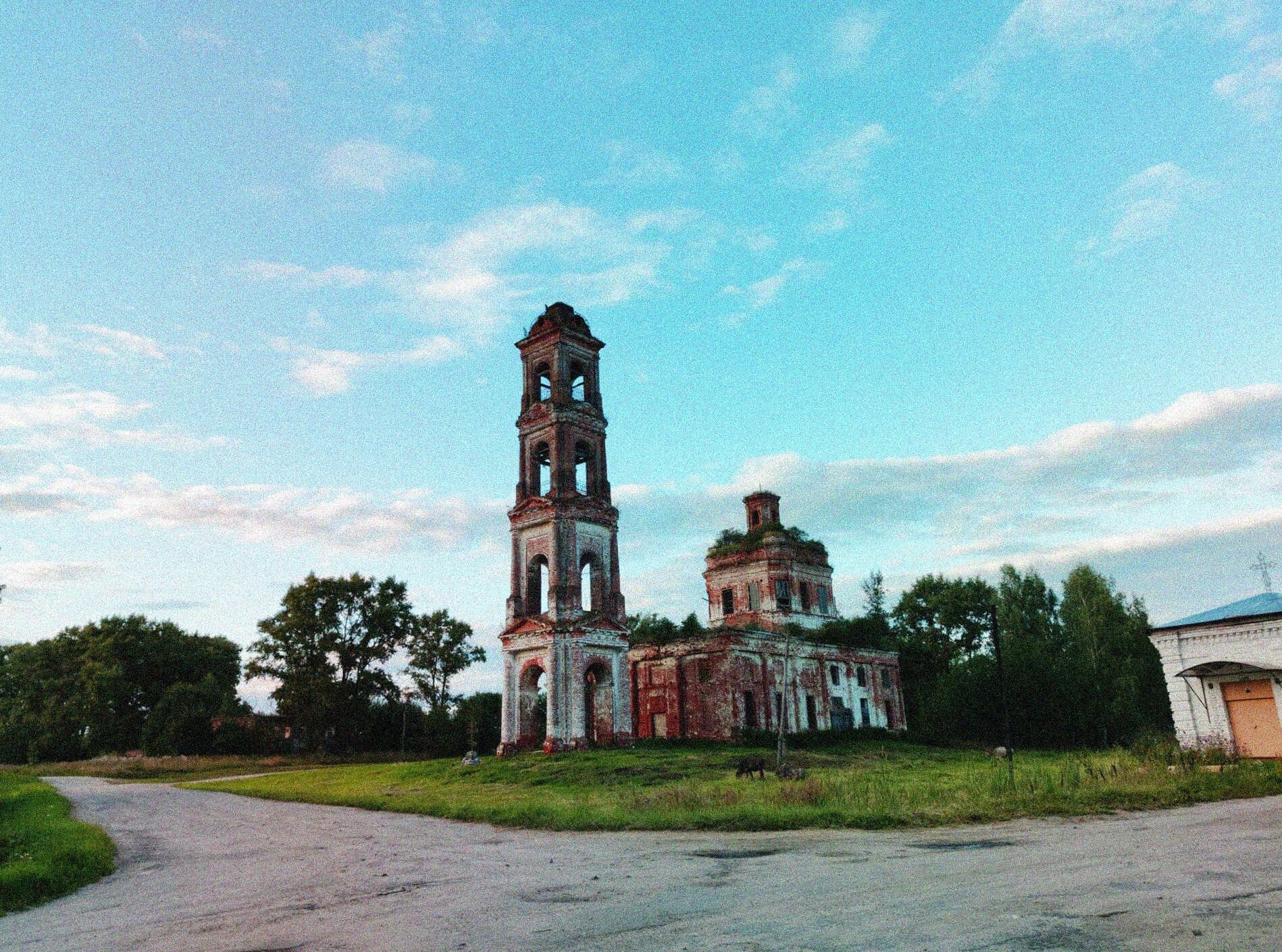 Оба сооружения выполнены из кирпича и в настоящее время пребывают в полуразрушенном состоянии. Кровля и своды храма частично обрушились, на фасадах заметны следы разрушения кладки и обильная растительность. Несмотря на значительные повреждения, монументальные здания сохраняют свою величественность и продолжают служить важным высотным ориентиром в окружающем ландшафте.
