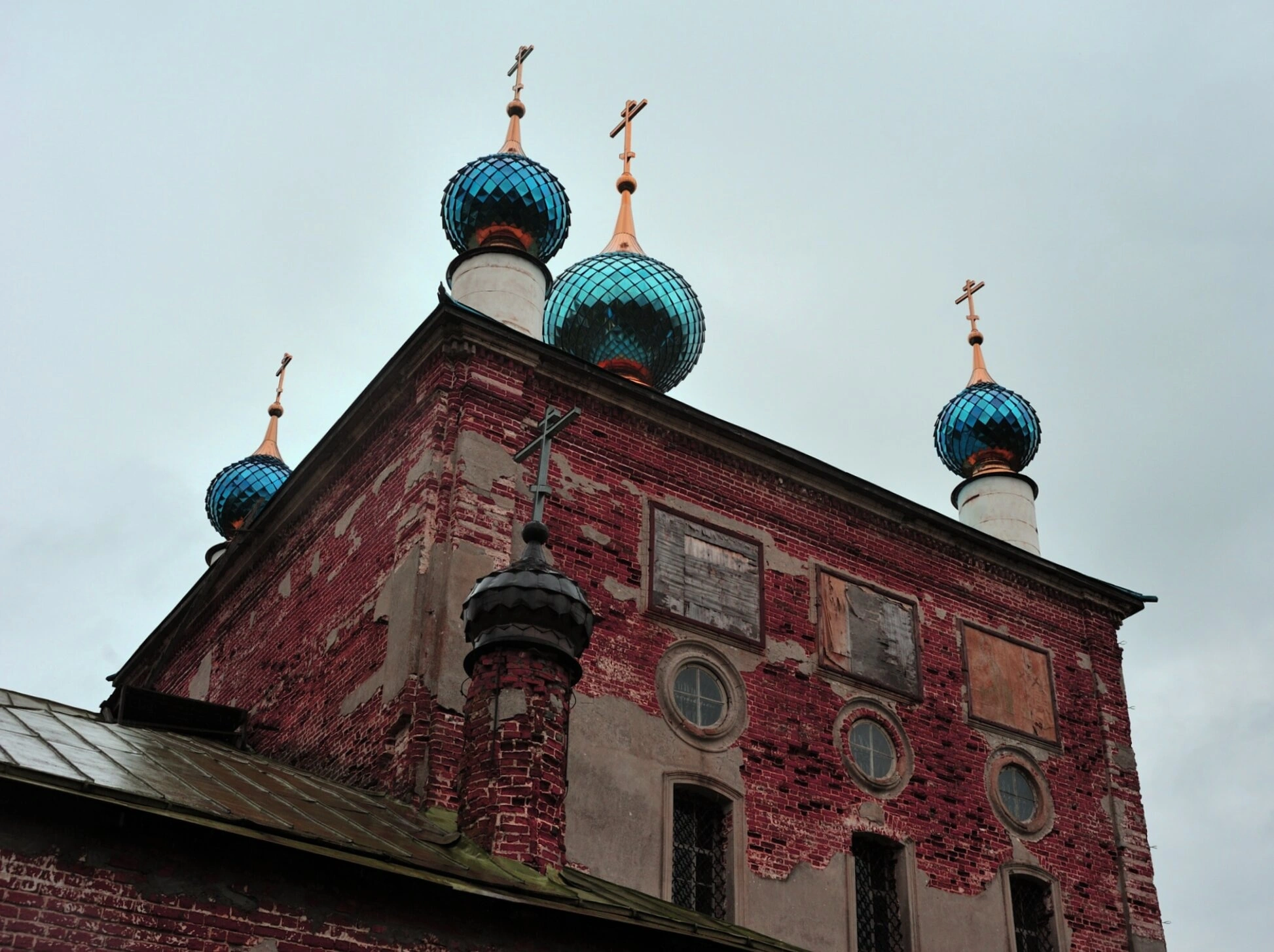 Взгляд приковывают пять сияющих глав, увенчанных златоглавыми крестами, символизирующими победу Господа нашего Иисуса Христа над смертью. Четыре основных купола глубокого лазурного цвета, напоминающего о небесной чистоте, и одна малая главка образуют каноническое пятиглавие. Несмотря на видимые следы времени на фасаде из красного кирпича, храм сохраняет своё благолепие и духовную силу.