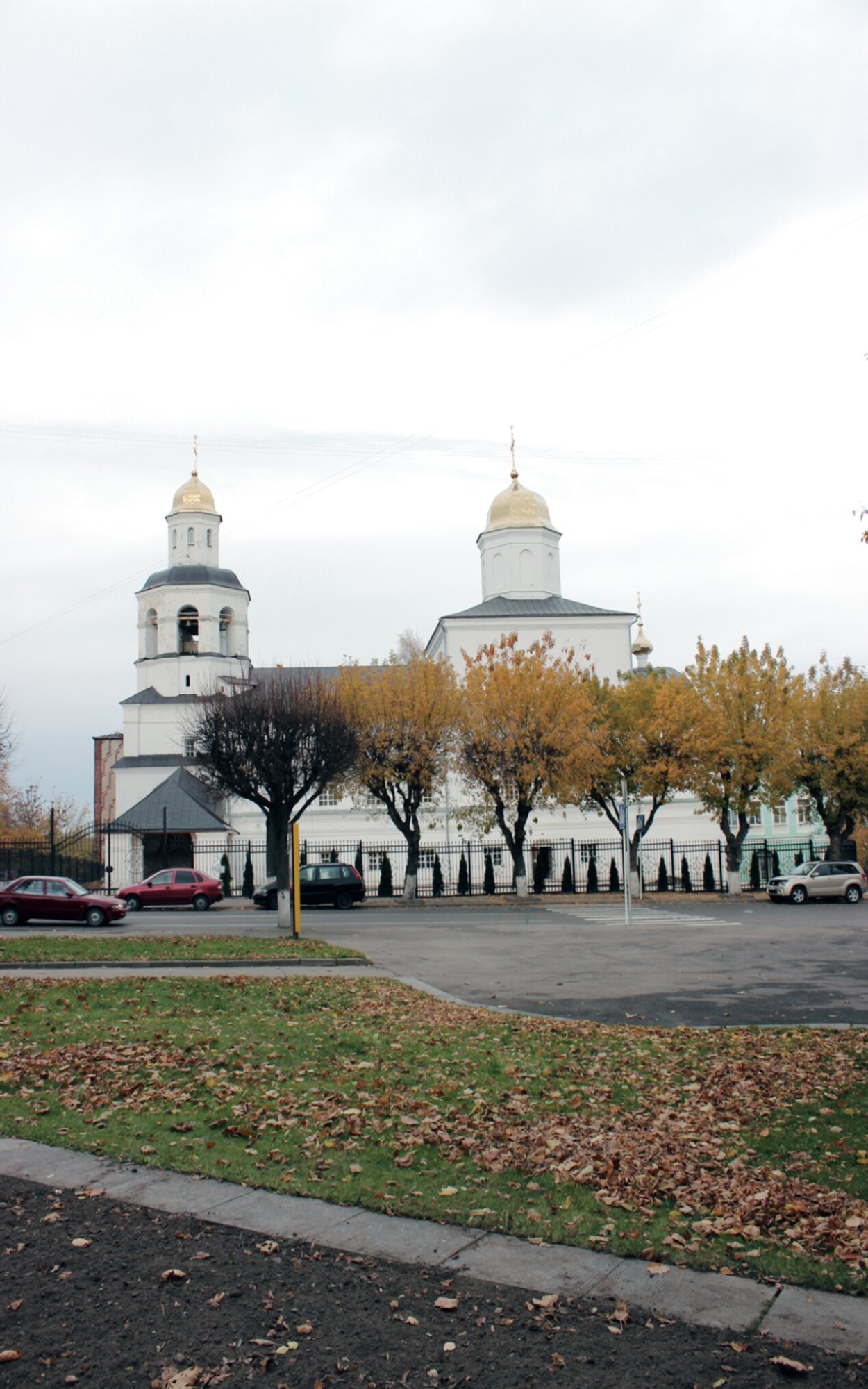 Территория вокруг храмов благоустроена; видны участки земли с опавшей листвой, что указывает на осеннюю пору съёмки. Вдоль асфальтированной дороги, огороженной невысоким ограждением, растут деревья с пожелтевшей кроной. Припаркованные автомобили напоминают о том, что монастырь, сохраняя свою духовную суть, находится в черте современного города.