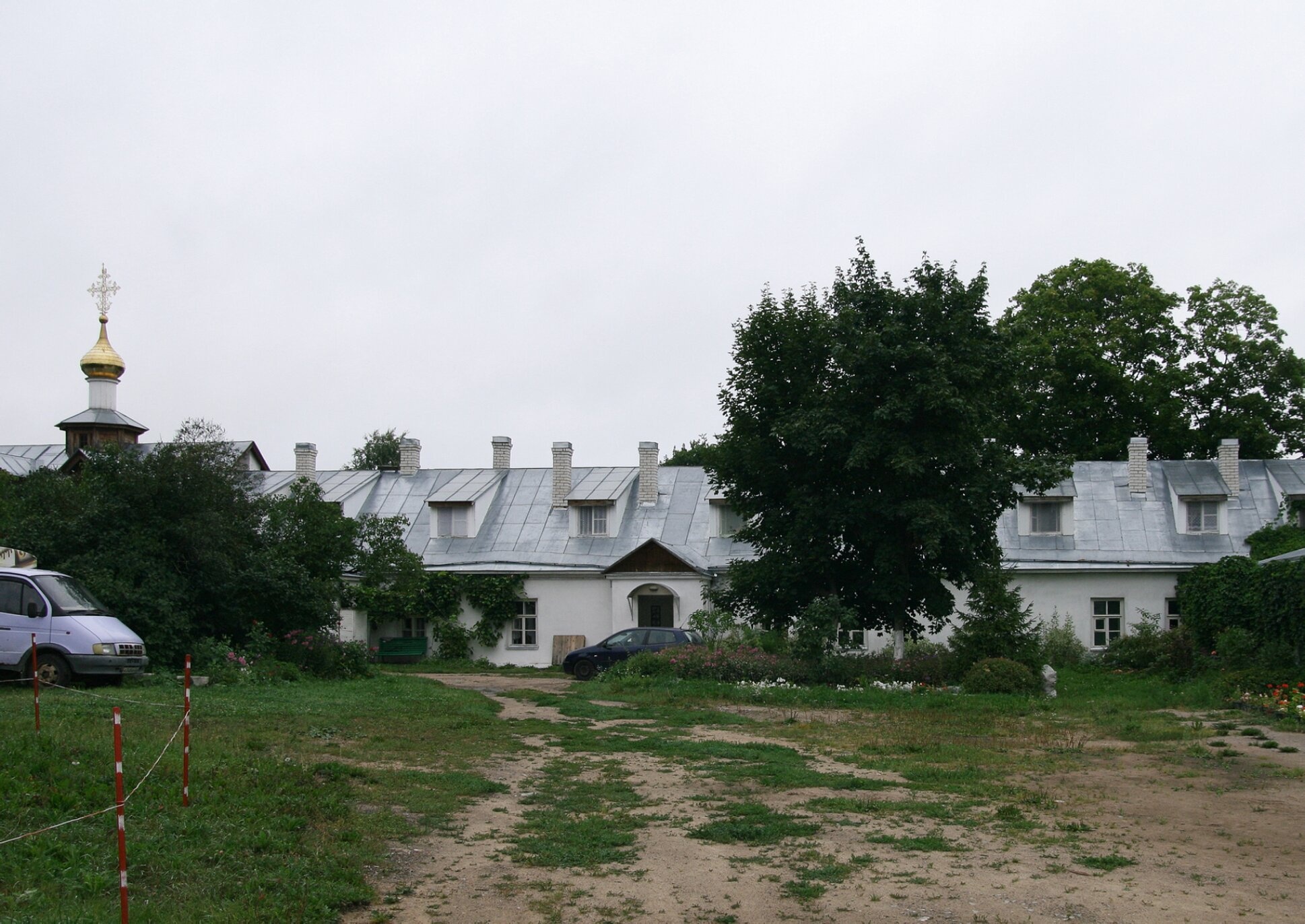 На представленной фотографии запечатлены хозяйственные и братские корпуса Снетогорского Рождества Пресвятой Богородицы монастыря, что располагается на окраине древнего Пскова. Данная обитель, основанная в XIII столетии, является одной из старейших на Псковской земле и имеет статус объекта культурного наследия.