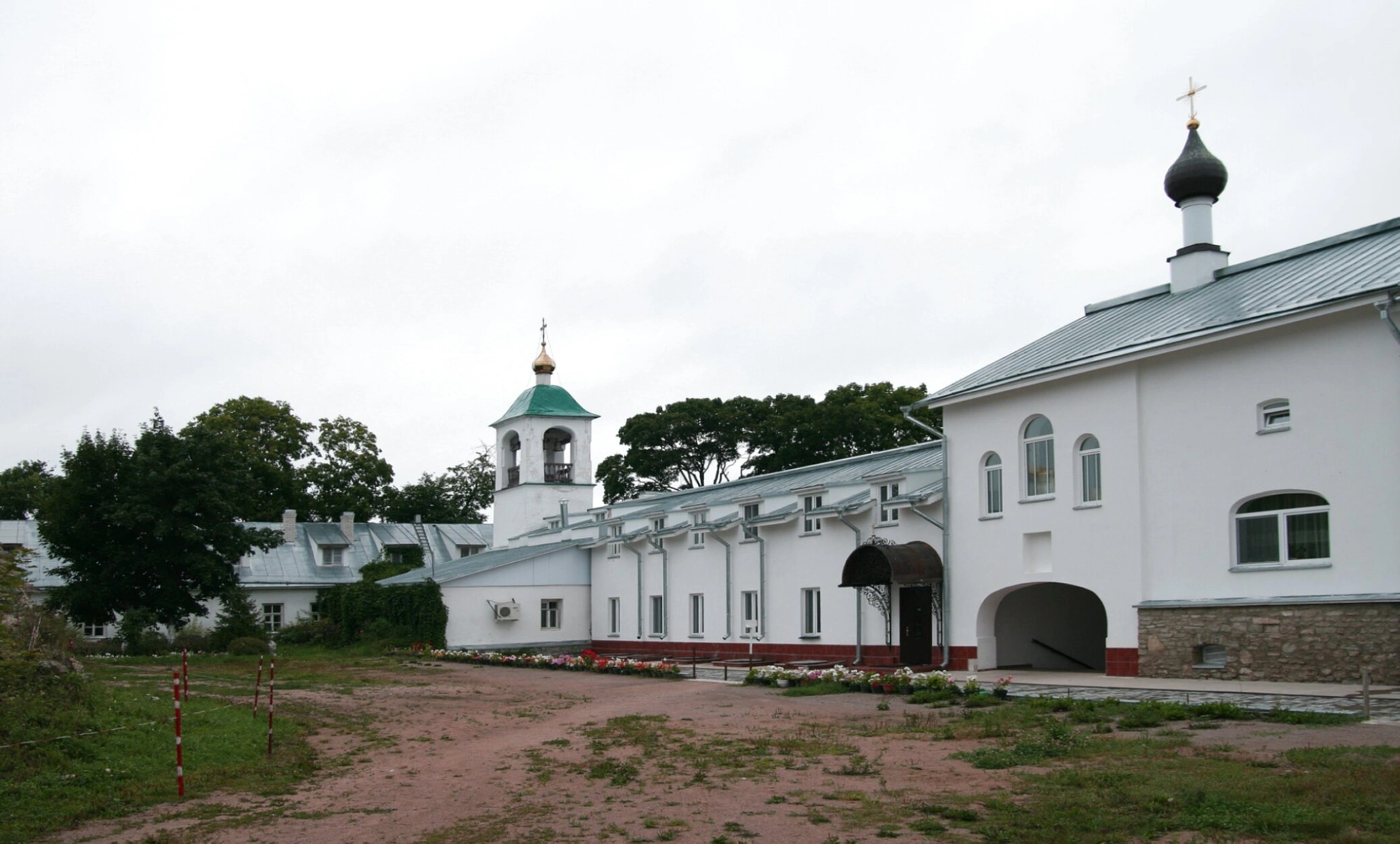 На переднем плане фотографии видны белоснежные стены и здания монастырского комплекса, увенчанные традиционными серыми скатными кровлями. Архитектурный облик обители сочетает в себе черты псковской школы зодчества и более поздние стилистические элементы. Доминирующим сооружением является соборный храм, увенчанный массивным куполом, на котором установлен сияющий крест – символ победы жизни над смертью. Неподалёку возвышается монастырская колокольня, завершающаяся изумрудной главкой с крестом, чей звон созывает братию на молитву.