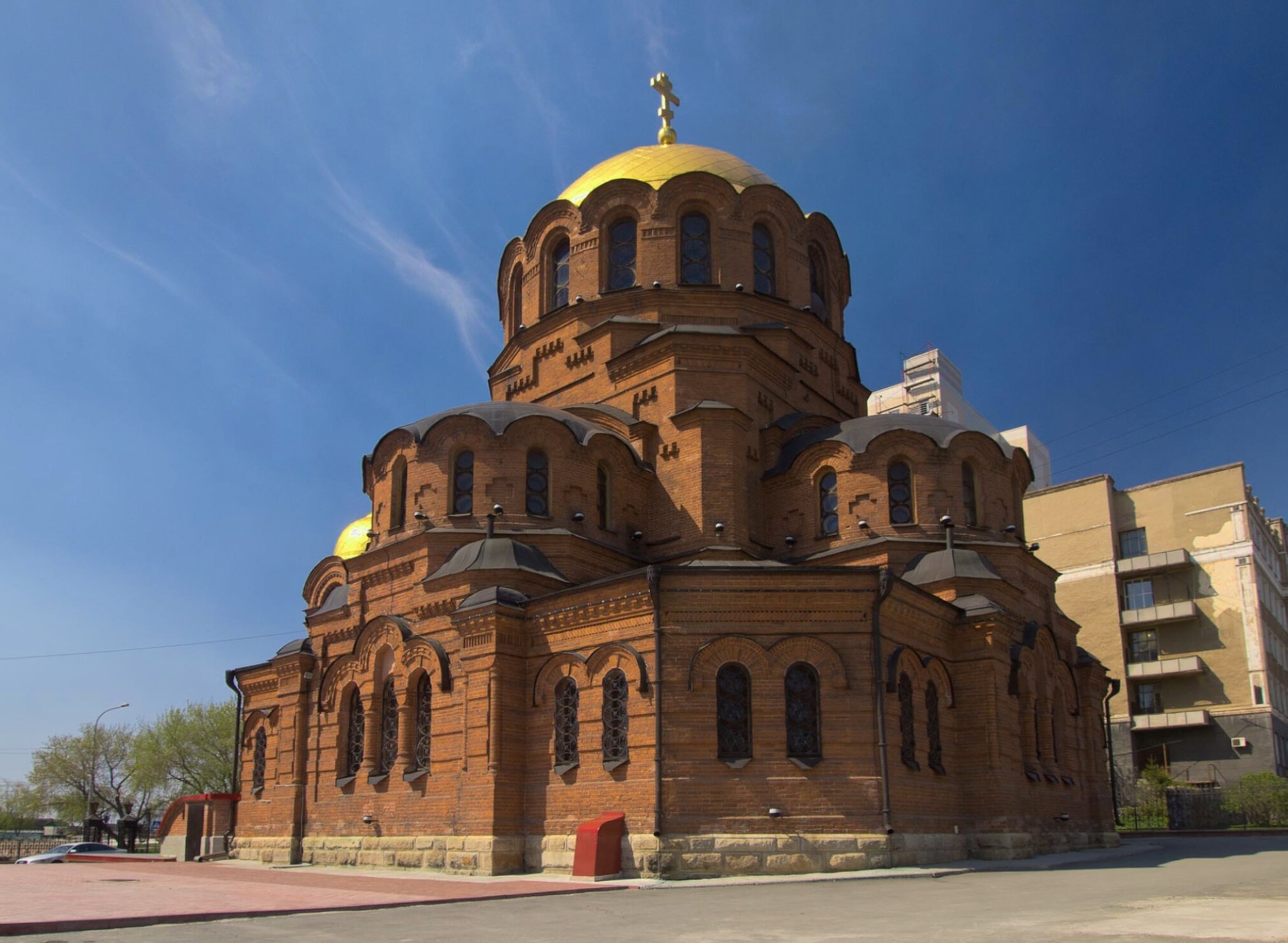 На представленной фотографии запечатлён величественный Собор во имя святого благоверного князя Александра Невского, один из первых каменных храмов Новосибирска и выдающийся памятник церковной архитектуры. Святыня, возведённая в неовизантийском стиле, впечатляет своим монументальным образом и духовным величием. Храм облицован красным кирпичом и увенчан златоглавыми куполами, главный из которых, символизирующий Христа, горделиво парит над городом, сияя на солнце.
