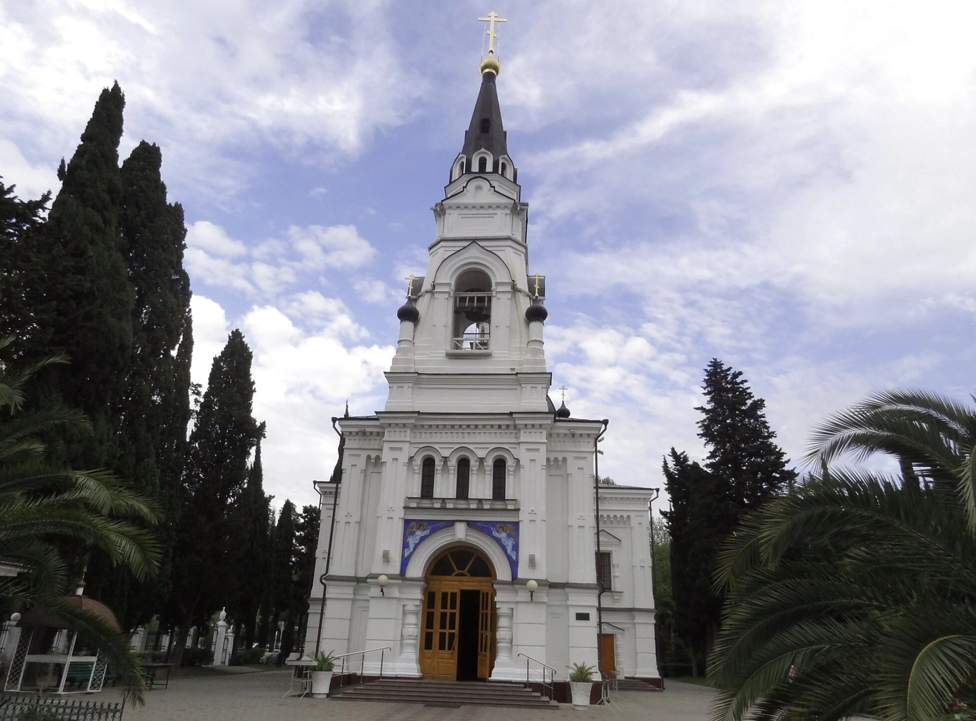 На представленной фотографии запечатлён величественный Собор во имя Святого Архистратига Михаила — старейший православный храм города Сочи, возведённый в память об окончании многолетней Кавказской войны. Освящение храма состоялось в 1890 году, а его строительство велось на средства из государственной казны и пожертвования благочестивых горожан.