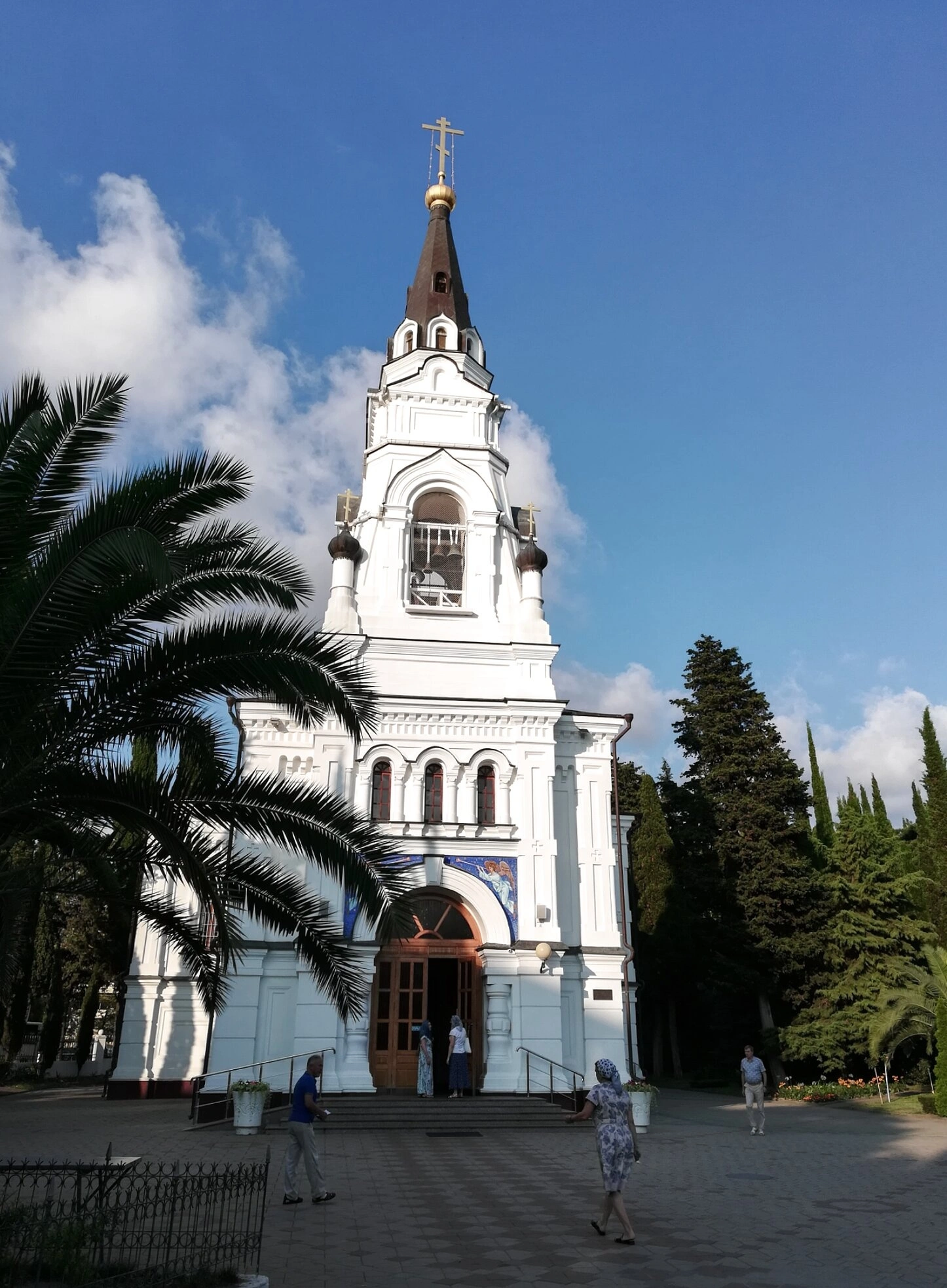 На фотографии запечатлён величественный Собор во имя Святого Архистратига Божия Михаила, находящийся в центральной части города Сочи, на улице Москвина. Этот православный храм, являющийся первенцем православного зодчества на Черноморском побережье Кавказа, был возведён в конце XIX столетия. Его строительство было ознаменовано окончанием многолетней Кавказской войны и осуществлено на средства из государственной казны, а также на пожертвования благочестивых граждан, в том числе и вклад Великого Князя Михаила Николаевича.