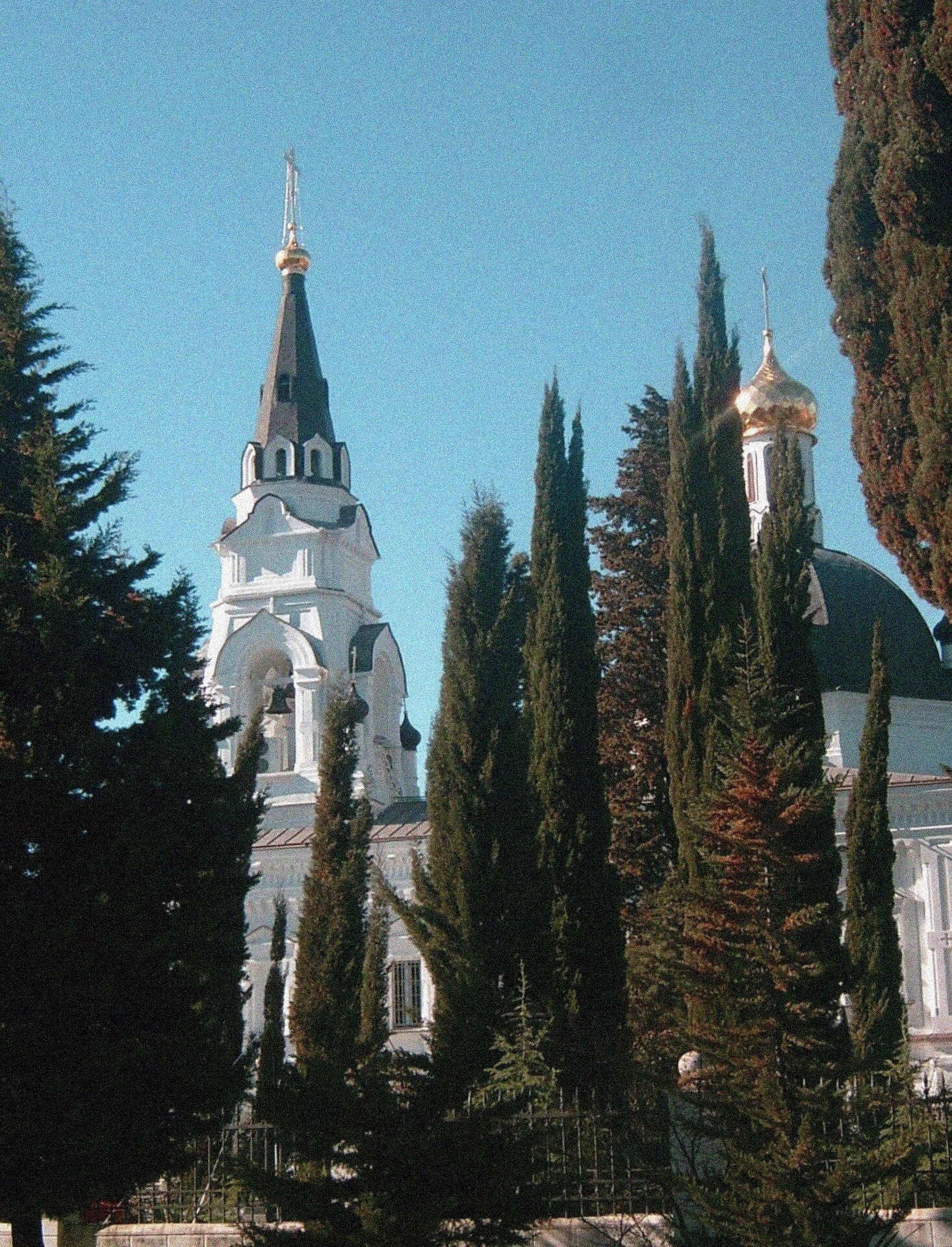 Белоснежные стены храма, увенчанные златоглавыми куполами, ярко выделяются на фоне южной растительности и лазурного неба. Архитектура собора выдержана в лучших традициях русского церковного зодчества. Стройная колокольня, устремлённая ввысь, гармонично дополняет архитектурный ансамбль. Вокруг храма произрастают кипарисы, создающие особую благоговейную атмосферу этого святого места.