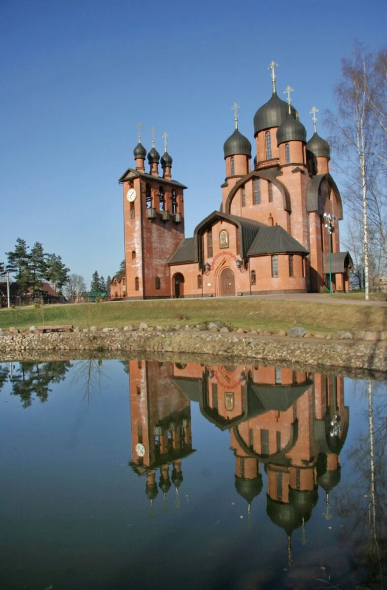На представленной фотографии запечатлён величественный Собор Архистратига Божия Михаила и всех Небесных Сил Бесплотных, находящийся в посёлке Токсово Всеволожского района Ленинградской области. Храм является духовным центром православной общины и выдающимся памятником церковного зодчества.
